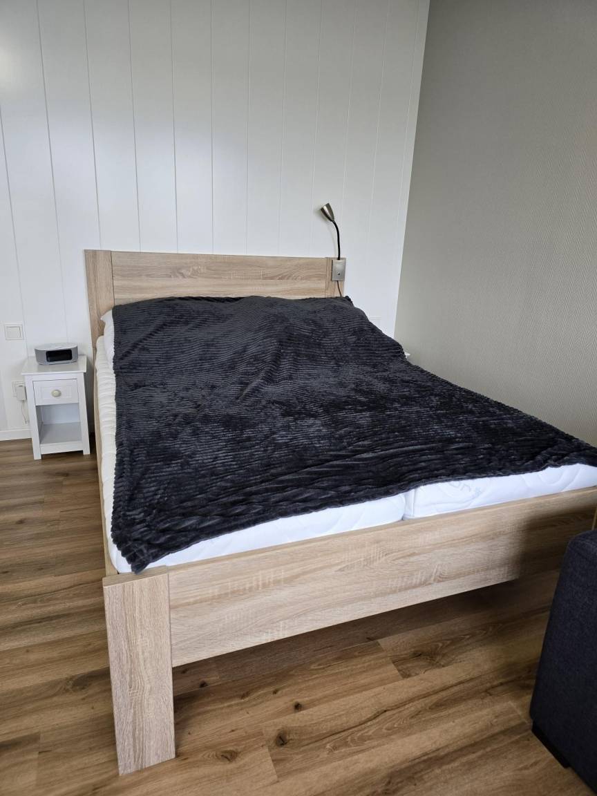 Sie verfügt über einen Wohn/Schlafraum mit einem Doppelbett (140x200), einem kleinen Sofa, sowie einem Esstisch mit vier Stühlen.