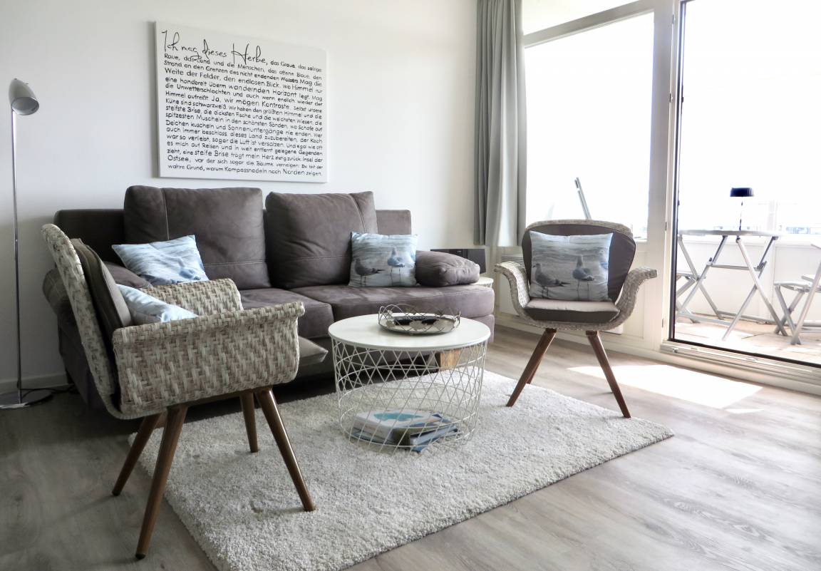 Die Strandbude ist mit einer stylischen Küchenzeile mit Geschirrspüler ausgestattet, einem kleinen, aber feinen Bad mit Dusche, einem gemütlichen Boxspringbett, Schlafsofa, Essecke, TV und Balkon mit Blick aufs Meer. Durch die große Fensterfront mit Meerblick wirkt die Strandbude besonders hell, freundlich und gemütlich. Wer möchte, nimmt den Fahrstuhl in die 3. Etage des Mehrfamilienhauses, um in der Strandbude zu stranden...