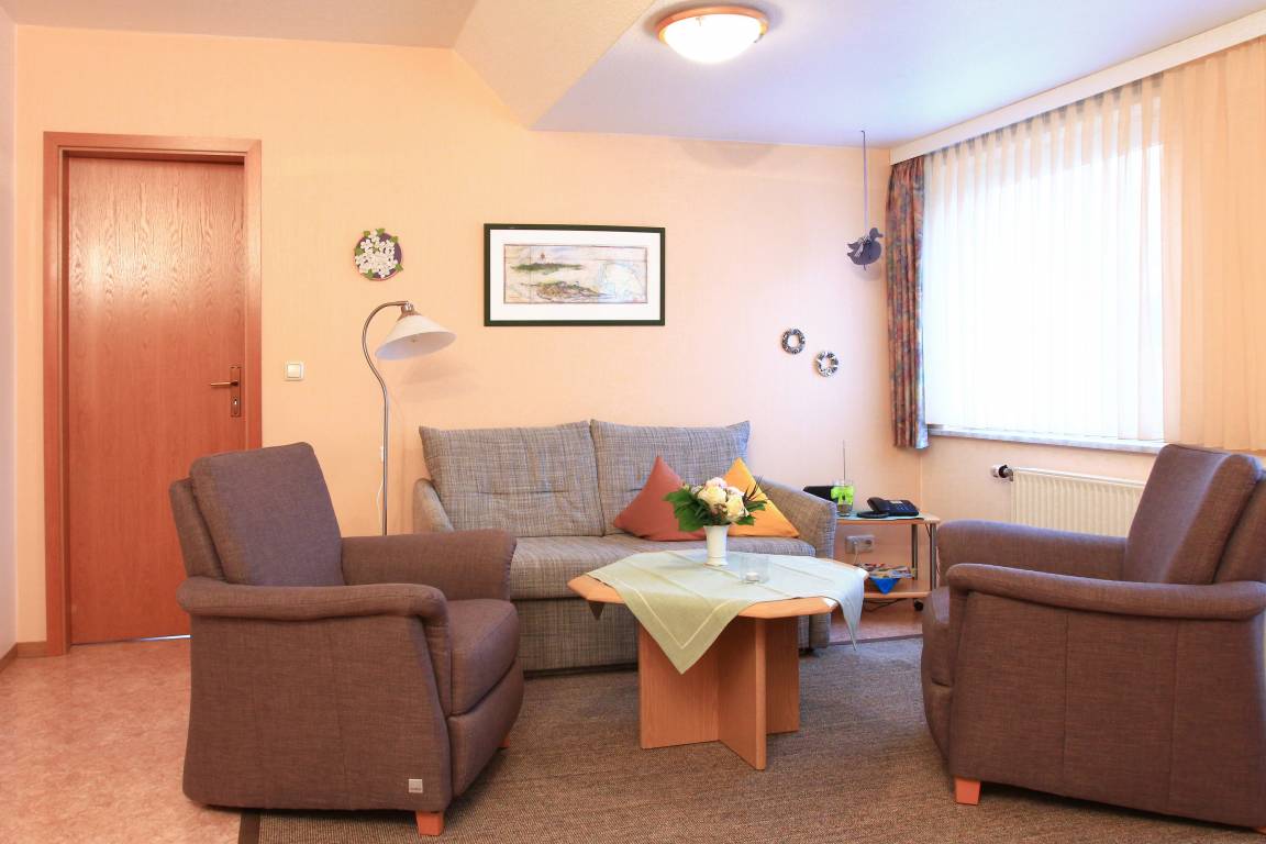 Die helle gemütliche Ferienwohnung für 3 Personen liegt im Obergeschoss im Bauernhaus.Keine schrägen Wände, Wohnraum mit offener umfangreich ausgestatteter Küche ,1 Duschbad mit WC ,1 großzügiges Schlafzimmer.Strandkörbe und Liegen stehen Ihnen im großen Garten zur Verfügung,während die Kinder das Angebot des Hofes nutzen.