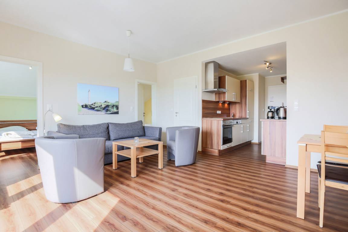 Wohnung "Süd" (61qm): Die Wohnung befindet sich im ersten Stock des Bauernhauses. Sie hat zwei separate Schlafzimmer, Duschbad mit WC, einen Wohnraum mit voll ausgestatteter Küche, Esstisch, Sofagarnitur, Doppelbett, Flachbild-TV, DVD-Player usw. und einen Südbalkon mit Blick auf den Spielplatz, die Ponyweide und die Ostsee. Die modern renovierte Wohnung ist vom DTV mit vier Sternen ausgezeichnet.