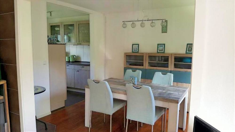 Vom Eingangsbereich aus erreichen Sie über den Flur das gemütliche Wohnzimmer mit Kamin und vorgelagerter Terrasse, die offene sehr gut ausgestattete Küche, und das Duschbad.