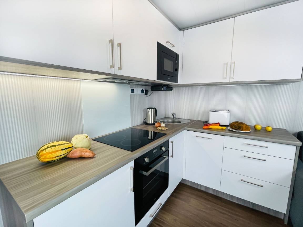 Im Garten des Gutes Teichhof erwartet Sie das Tiny House Jack Rackham für Ihren entspannten Urlaub am Meer. Dieses Strandhaus hat Platz für 2 Erwachsene und 2 Kinder und bietet einen atemberaubenden Blick auf das Meer. Genießen Sie die Behaglichkeit eines Doppelbettes im Schlafzimmer sowie das eigene Badezimmer mit Dusche. Die Wohnküche ist mit modernen Annehmlichkeiten wie Filterkaffeemaschine, Mikrowelle und Spülmaschine ausgestattet. Ihre private 15 m² große Terrasse lädt im Garten zum Entspannen ein. Der Strand liegt direkt vor Ihrer Tür und verspricht Momente der Ruhe und Erholung. Überdachte Fahrradabstellmöglichkeiten und Parkplätze für Ihr Auto stehen auf dem Gelände des Gutshofs zur Verfügung. Zum Be- und Entladen können Sie gerne direkt am Strandhaus halten. Das Check-in erfolgt bequem eigenständig. Auf dem Gelände des Teichhofes erwartet Sie zudem ein Streichel-Zoo mit Schafen und eine Wiese mit Ponys. [nbsp]Das Strandhaus Jack Rackham kann in der Hauptsaison 16.07. bis 24.08. nur wochenweise gebucht werden. Anreise Tag ist in der Hauptsaison der Montag. Weihnachten und Sylvester 15.12. bis 10.1.Mindestaufenthalt 5 Nächte. Für den Rest des Jahres beträgt der Mindestaufenthalt 2 Nächte, Anreisetage sind dann beliebig. Es wird bei der Erstellung der Buchungsbestätigung eine Kaution von 150 EUR und die Kurabgabe der Stadt Fehmarn erhoben (Hauptsaison 2,30 EUR sonst 1,50 EUR) Für den individuellen Stromverbrauch fallen vor Ort Gebühren in Höhe von 70 Cent pro kWh an, die vor der Abreise zu begleichen sind.