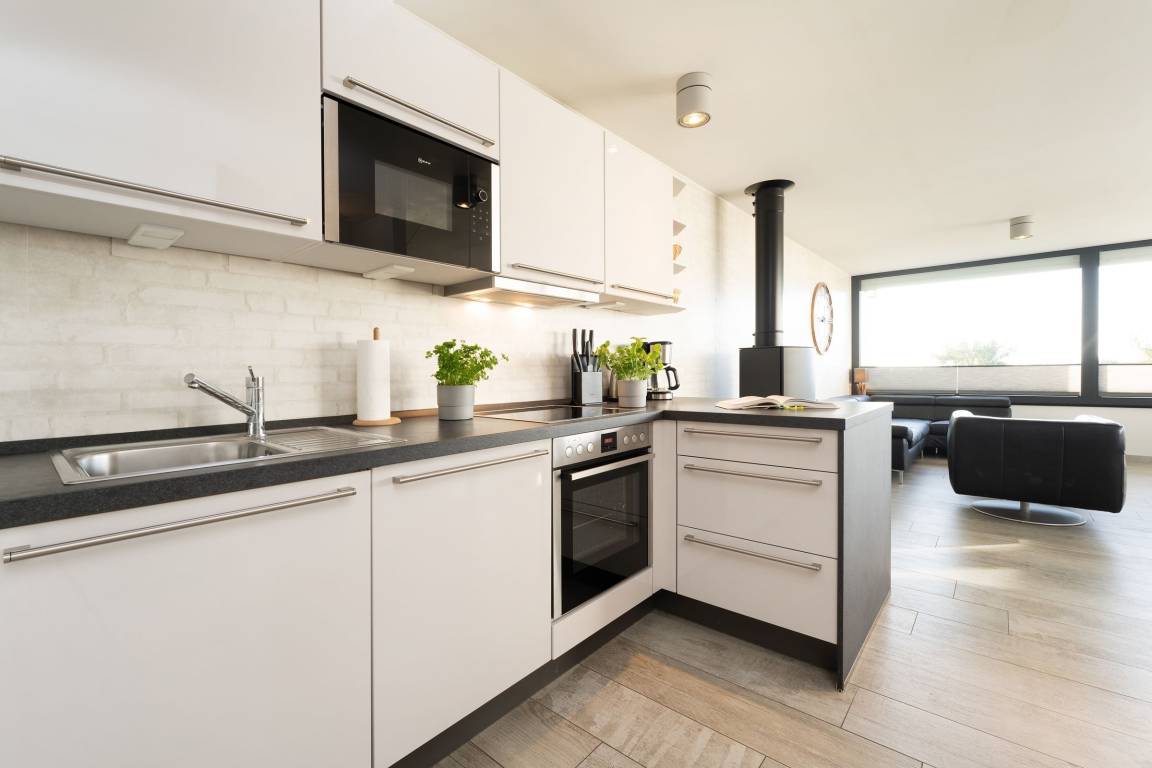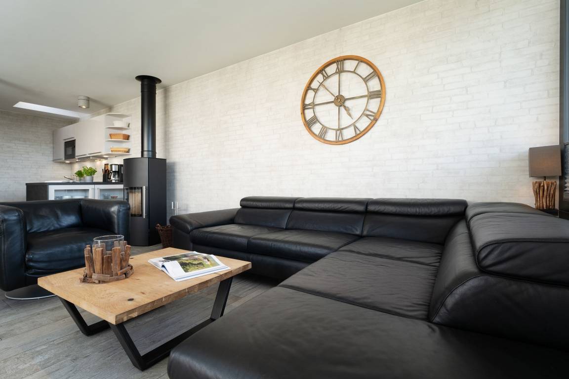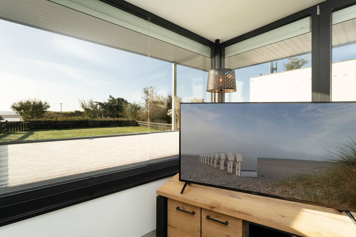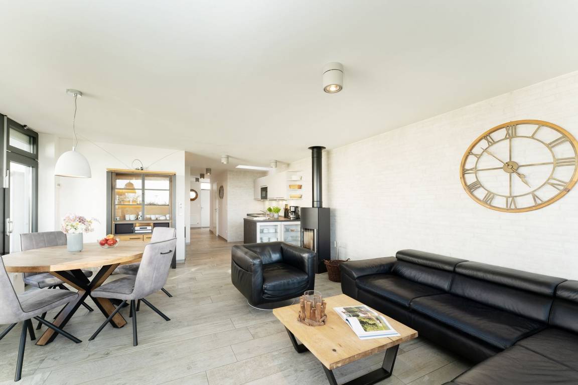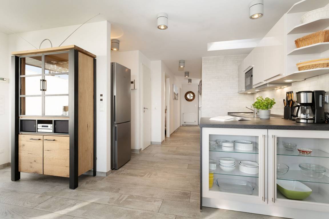 Die moderne Ausstattung in allen Räumen sowie ein komplett gefliester, ebenerdiger Fußboden mit Fußbodenheizung wird Sie sofort begeistern. Der gemütliche Wohn-/Essbereich ist mit einem TV, Blue-ray-Spieler und einer HiFi-Anlage ausgestattet. Die große Ledercouch lädt zum Entspannen ein, ein Kaminofen sorgt für kuschelige Wärme und Gemütlichkeit. Die große Fensterfront über zwei Seiten mit Blick auf die Terrasse schenkt viel Licht und Helligkeit.