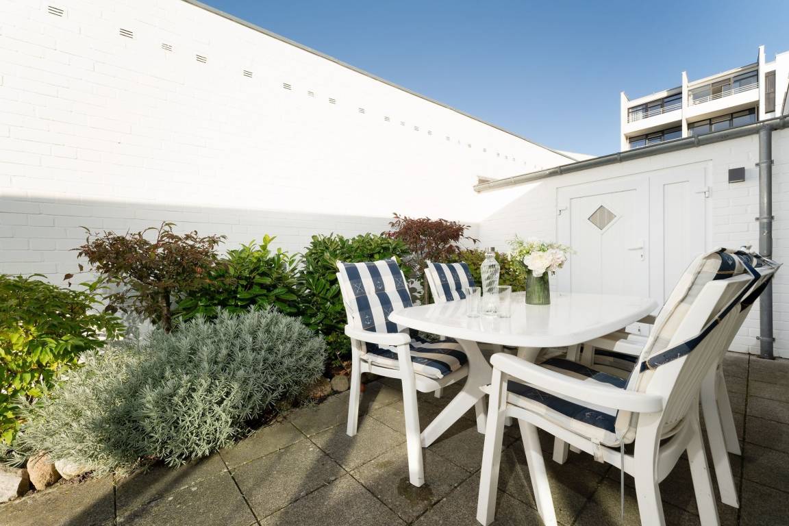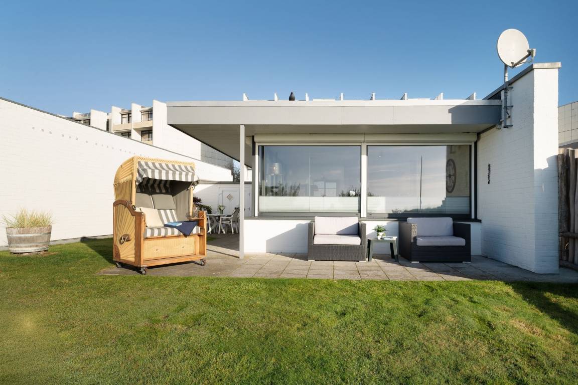 Die teilweise überdachte Terrasse ist Richtung Meer / Süden ausgerichtet. Gemütliche Sonnenmöbel sowie ein herrlicher Strandkorb stehen Ihnen im Garten zur Verfügung. Die offene Küche ist gut ausgestattet und verfügt zum Beispiel über einen Backofen, Geschirrspüler und eine Mikrowelle. Es gibt zwei Schlafzimmer: Ein Raum davon ist mit einem Doppelbett und TV, der zweite Schlafraum mit zwei Einzelbetten und ebenfalls einem TV ausgestattet. Alle Räume haben Außenrolladen. Das moderne Duschbad hat Tagesoberlicht. Vom Garten aus gelangen Sie direkt auf die Südstrandpromenade und zum Strand, die Entfernung zum Meer beträgt nur rund 50 Meter.