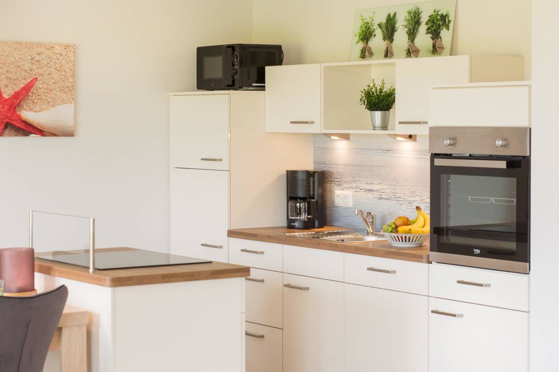 Die Küche mit Kochinsel, integrierter Mikrowelle, Gefrierfach und Backofen auf Augenhöhe ist komplett mit Geschirr, Geschirrspüler, Kaffeemaschine, Mixer, Wasser- und Eierkocher ausgestattet.
