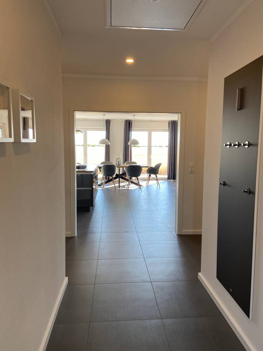 Das Highlight des Hauses ist der kombinierte Wohn- und Essraum mit Küche und Kochinsel. Dieser ist lichtdurchflutet und von diesem gelangt man auf die Süd-/Westterrasse. Auf dieser stehen ein Strandkorb, ein Sonnenschirm, ein Tisch mit ausreichend Sitzgelegenheiten und ein Grill.
