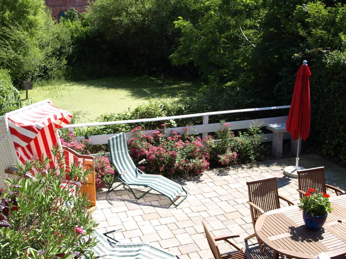 Jetzt ist Erholen angesagt: Auf der geschützten, sonnigen Terrasse mit Teakholzmöbeln, Strandkorb, Liegen, Sonnenschirm und eigenem Grill. Genießen Sie den wunderbaren Blick in den herrlichen Garten des Bauernhofes mit altem Baumbestand und dem naturbelassenen Teich.