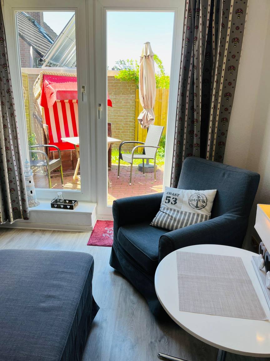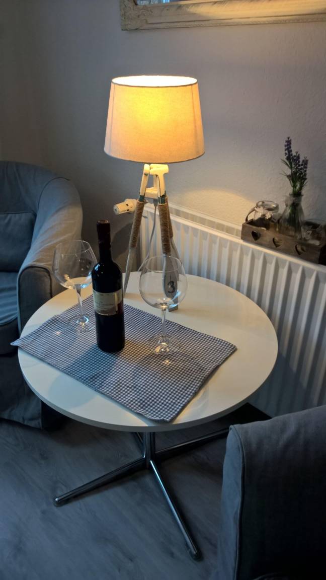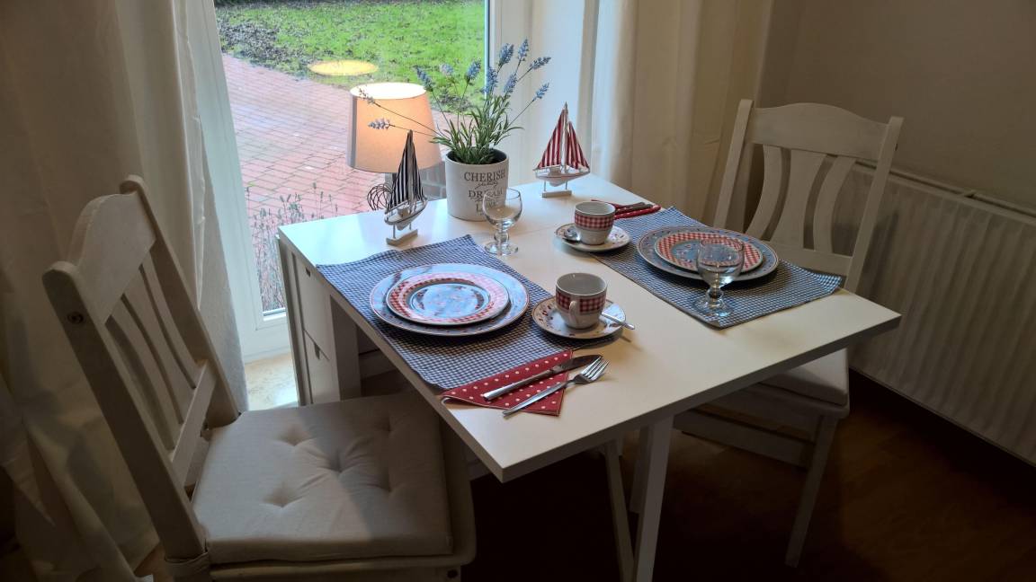 Die Ferienwohnung ist hell und modern eingerichtet. Die Küche ist komplett mit Kaffeemaschine, Wasserkocher, Toaster und Geschirr ausgestattet.
