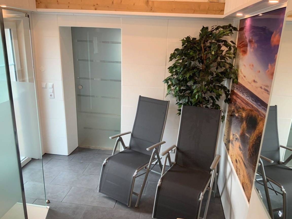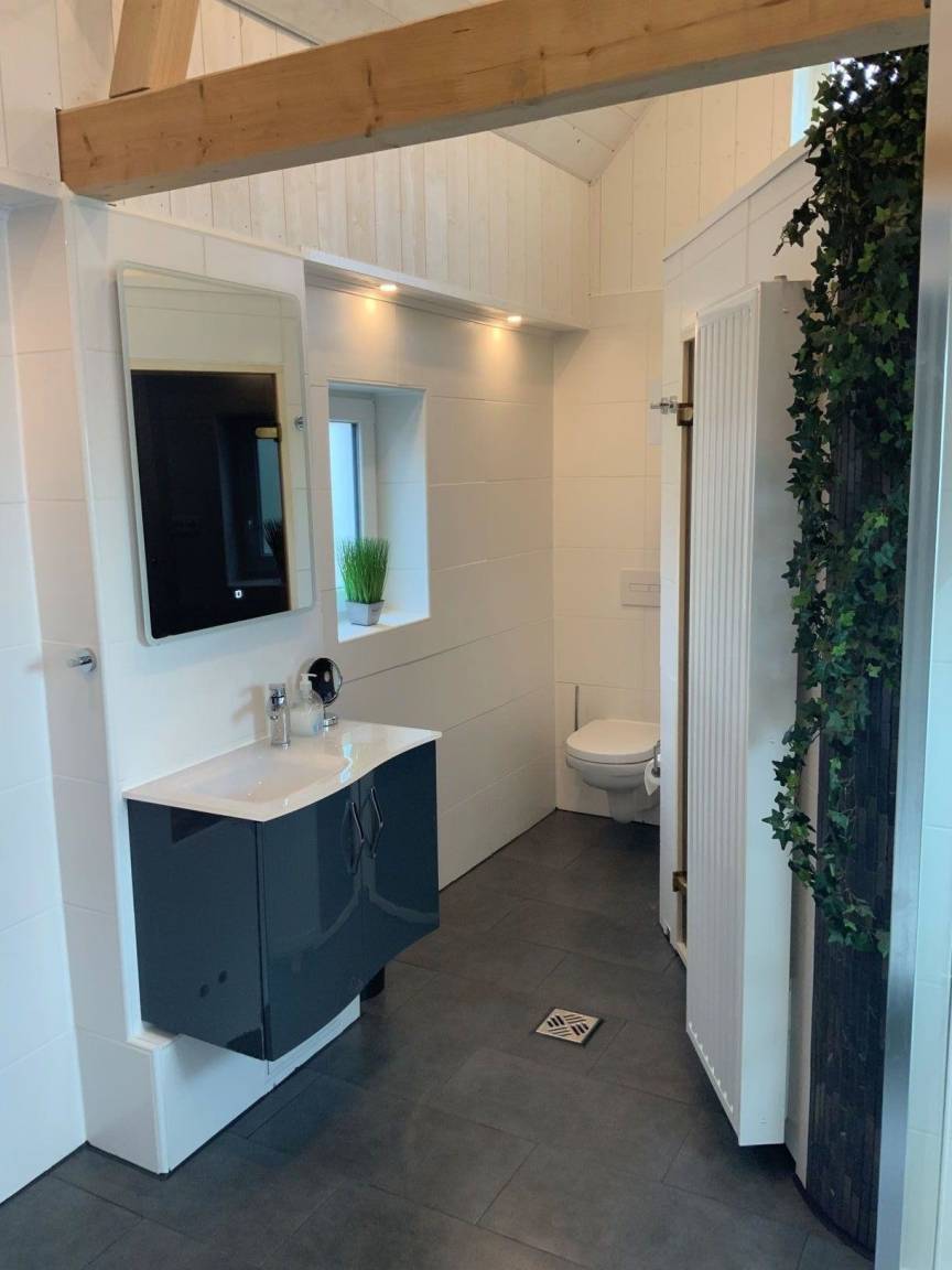 Das Wellnessbad im EG ist mit einer Sauna, großer Walk-in Dusche, Ruheliegen, Toilette und Waschtisch ausgestattet. Eine zusätzliche el. Fußbodenheizung sorgt für wohlige Wärme.