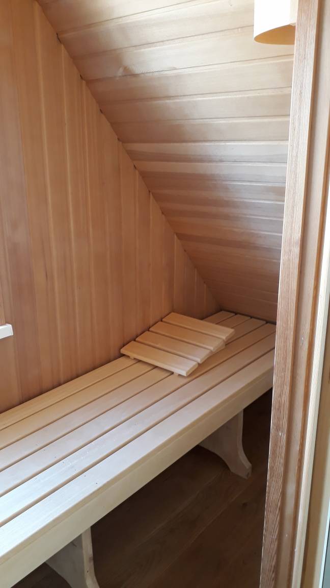 Sie verfügt über ein Wohnzimmer mit Kamin, einer offener Küche, einem Duschbad, eine eigene Sauna und einem Schlafzimmer, dieses befindet sich in 1. Stock.