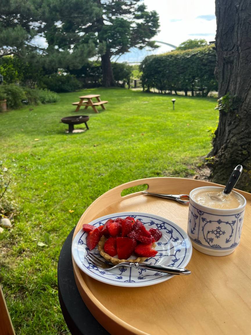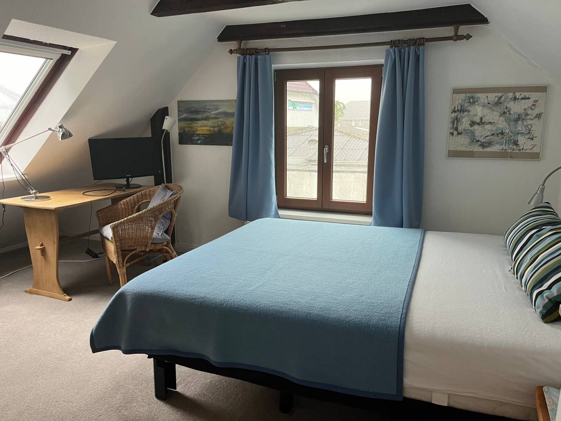 Das Obergeschoss verfügt über einen großen Wohn-/Schlafraum mit herrlichem Blick auf den Sund und die Brücke und ist mit zwei Einzelbetten und separatem Sofa ausgestattet. Außerdem gibt es ein weiteres Schlafzimmer mit Doppelbett (200 x 160) und Waschtisch