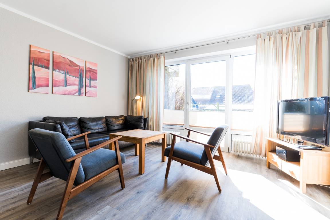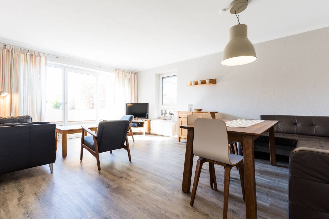 Im lichtdurchfluteten Wohn-Ess-Zimmer erwarten Sie ein Flachbid-TV mit DVD-Player, ein Radio und ein CD-Player.