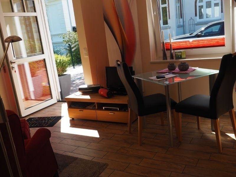 Unsere modern eingerichtet Wohnung für 2 Personen hat eine kleine Terasse zu Süden direkt an der Wohnung. Dort steht Ihnen ein Strandkorb und Gartenmöbel zur Verfügung.