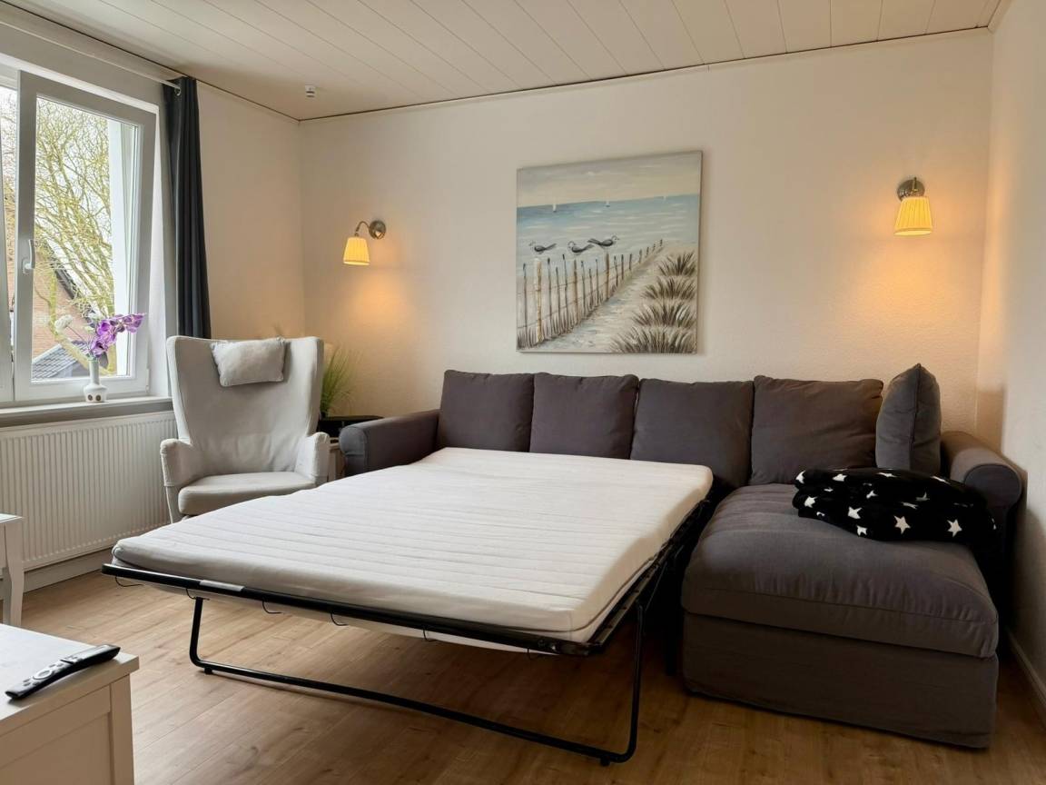 unsere sonnendurchflutete, modern eingerichtete Ferienwohnung (ca.39m²) ist für 4 Personen ausgelegt und besteht aus einem Wohnzimmer mit einem großen 42" Flachbildschirm, welcher mit einem digitalen SAT-Receiver verbunden ist. Als Ausstattung steht ein Eck-Schlafsofa zur Verfügung, welches für die 3. und 4. Person als Schlafmöglichkeit genutzt werden könnte, sowie ein gemütlicher Fernsehsessel. Weiterhin ist auch es etwas "Lesestoff" vorhanden.