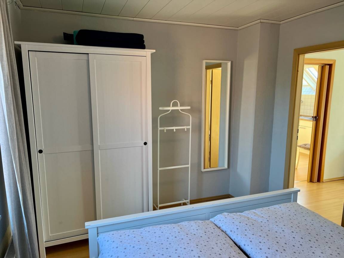 Das Schlafzimmer ist mit einem gemütlichen Ehebett ausgestattet, sowie ein ausreichend dimensionierter Schrank für die Aufbewahrung Ihrer Kleidung. Natürlich sind auch zwei Nachtische vorhanden, welche mit kleinen Lampen versehen sind. Gerne stellen wir Ihnen ein Kinderreisebett kostenlos zur Verfügung. Die Bettwäsche und Handtücher können gegen Aufpreis mitgebucht werden.