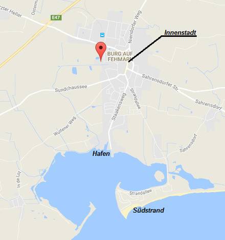 Unsere Ferienwohnung befindet im "Hauptort" Burg auf Fehmarn, in der Mühlenstraße 41 in Burg auf Fehmarn, sie ist am Stadtrand aber trotzdem sehr zentral gelegen. Zu Fuß sind es gerade mal 5 Minuten (650 Meter) bis in die Innenstadt.