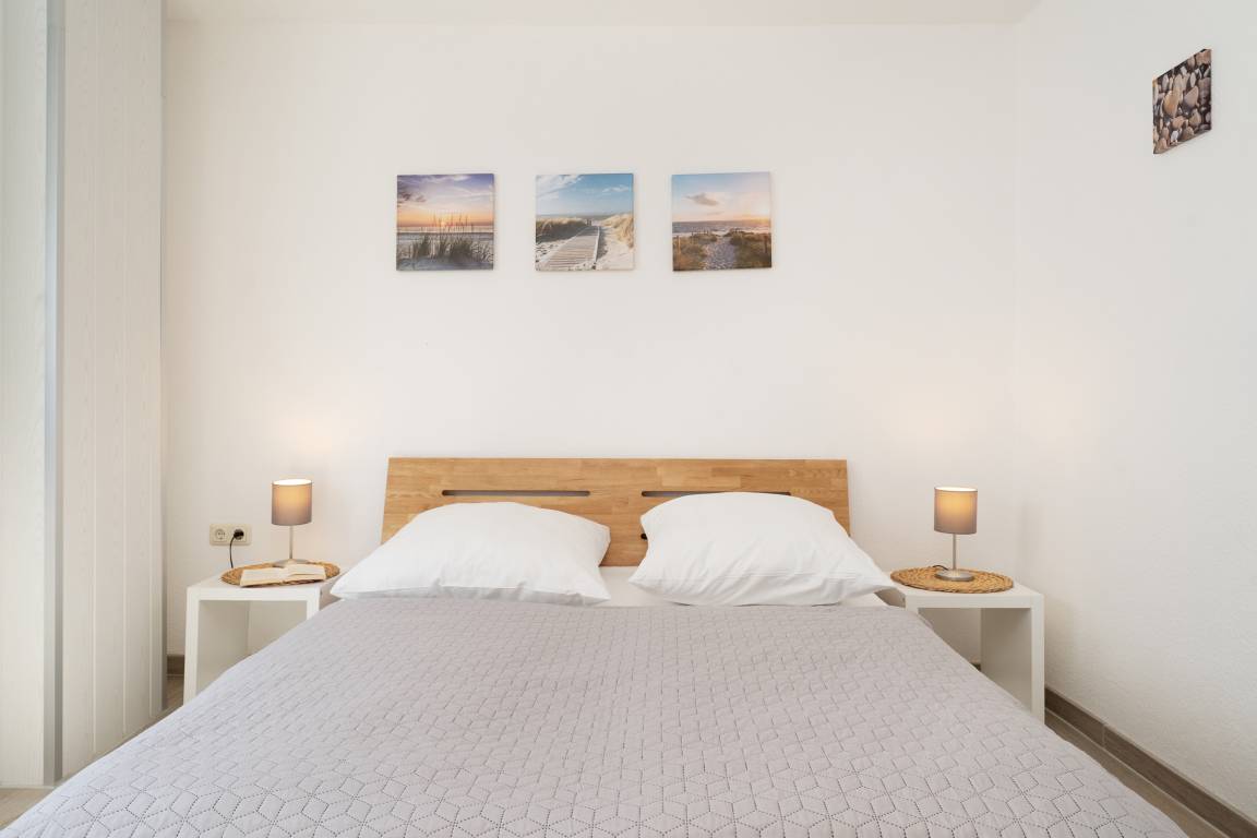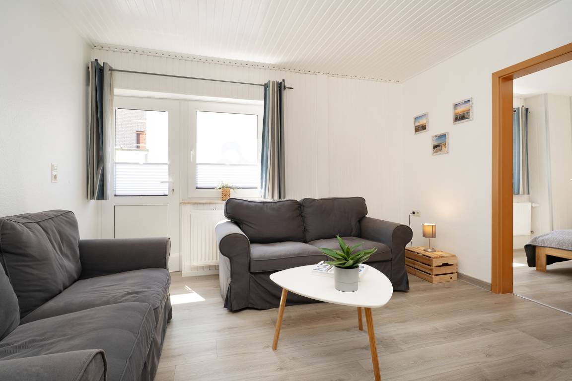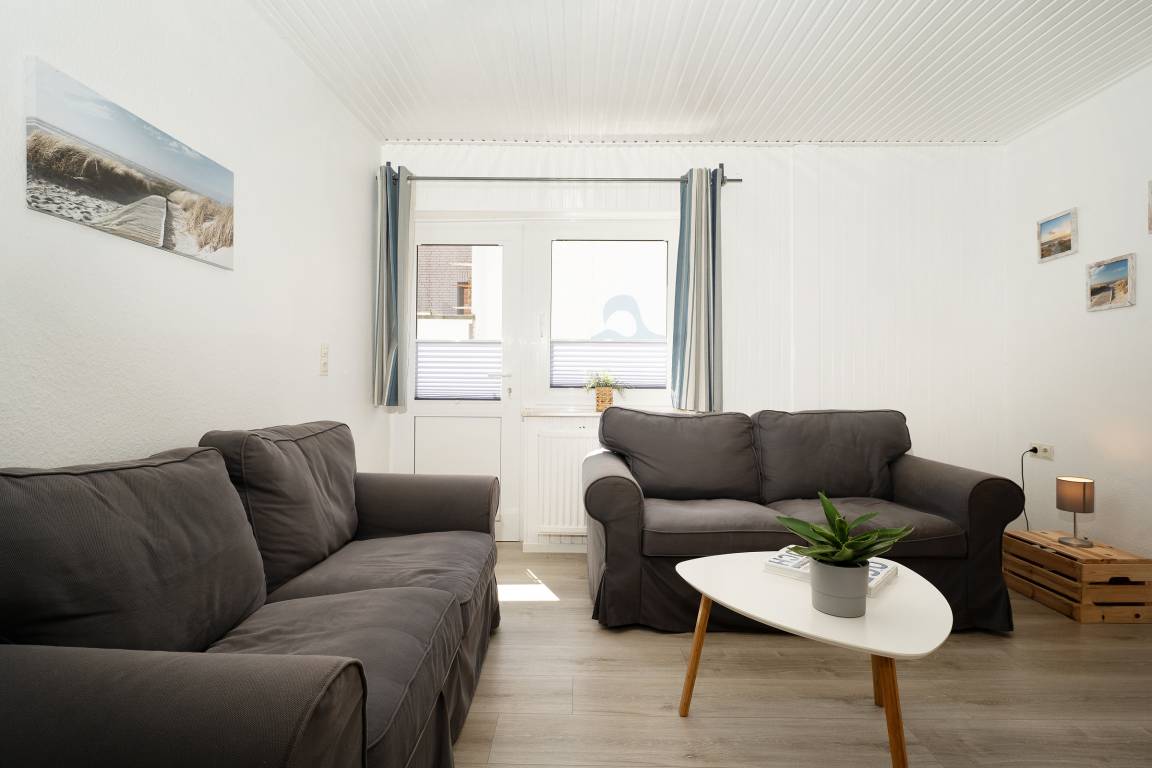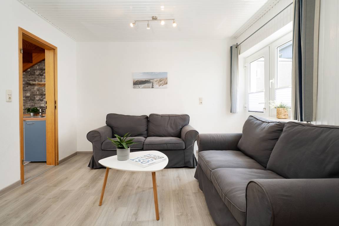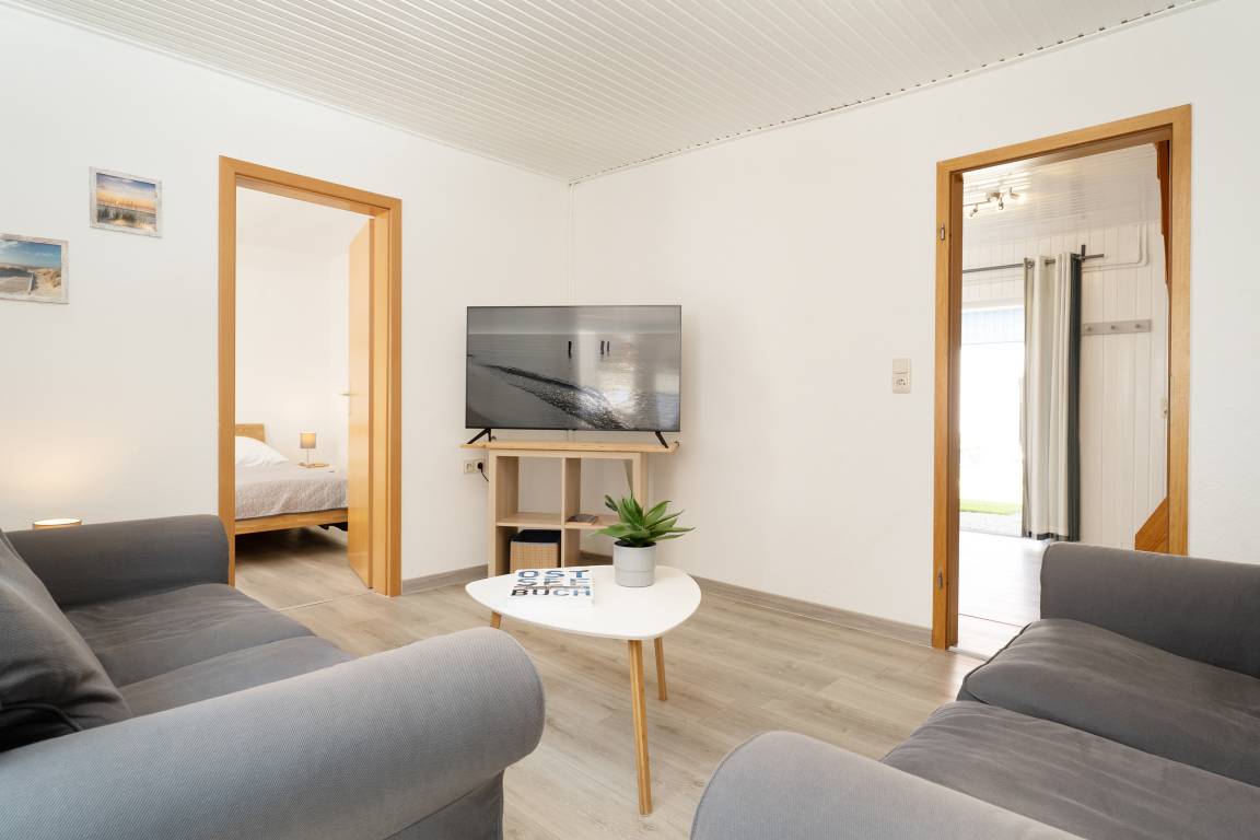Der helle Wohnbereich lädt mit einem gemütlichen Sofa und einem Fernseher zu entspannten Abenden ein. Die Fenster schaffen eine freundliche Atmosphäre, in der Sie sich sofort wohlfühlen. Die offene Küche ist mit allem ausgestattet, was das Kochherz begehrt: Kaffeemaschine, Kühlschrank mit Gefrierfach, Mikrowelle und ein Herd lassen keine Wünsche offen. Die beiden separaten Schlafzimmer bieten jeweils ein komfortables Doppelbett (2x 90x200 cm) und ausreichend Platz für erholsamen Schlaf. Das Badezimmer ist mit Dusche und WC funktional ausgestattet – perfekt für einen gemütlichen Start in den Tag. Direkt angrenzend befindet sich ein Gemeinschaftsgarten mit Gartenmöbeln, Sonnenliegen und einem Strandkorb– ideal für ruhige Stunden im Freien.