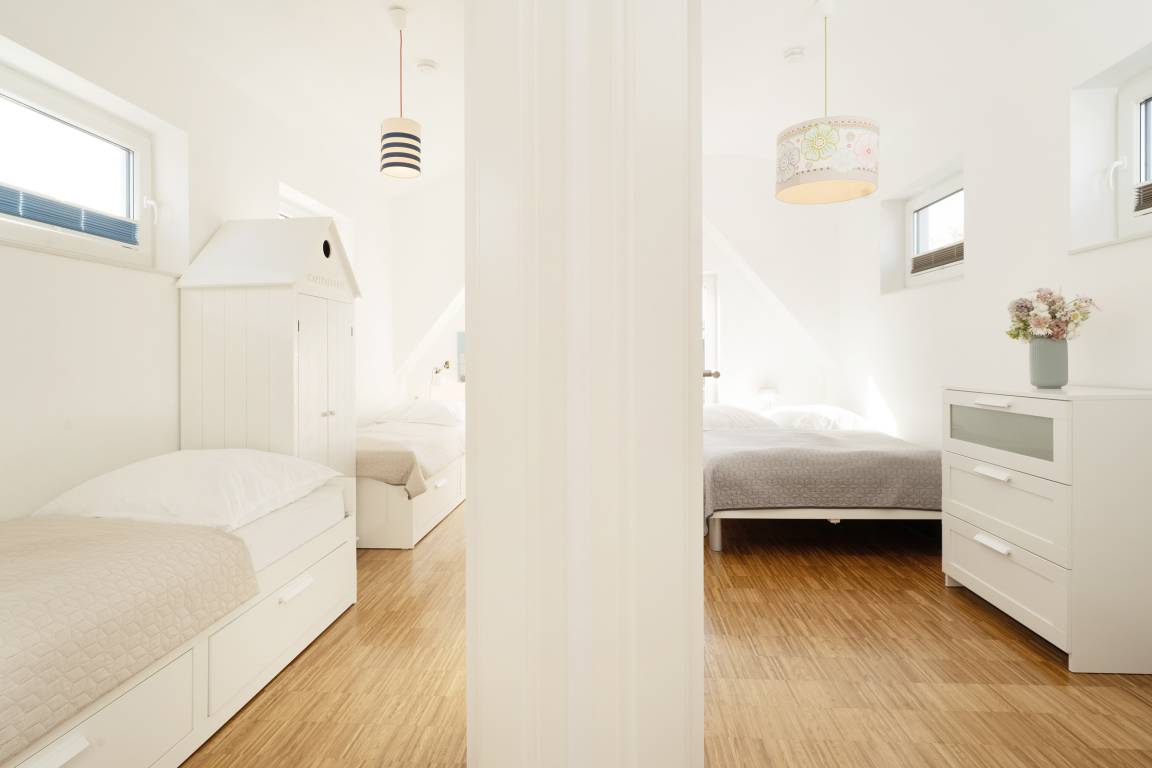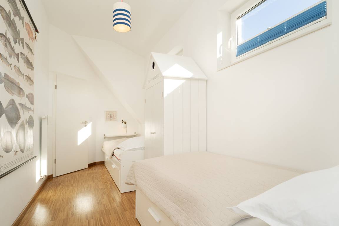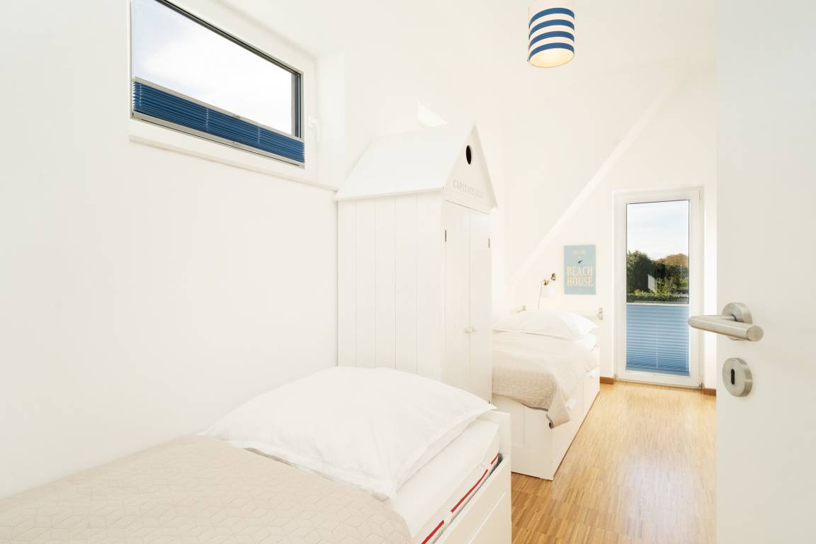Schlafzimmer 2: 2 Einzelbetten (je 80x200 cm), Kleiderschrank, Verdunkelung: Plissee, kein Platz für ein Babybett vorhanden