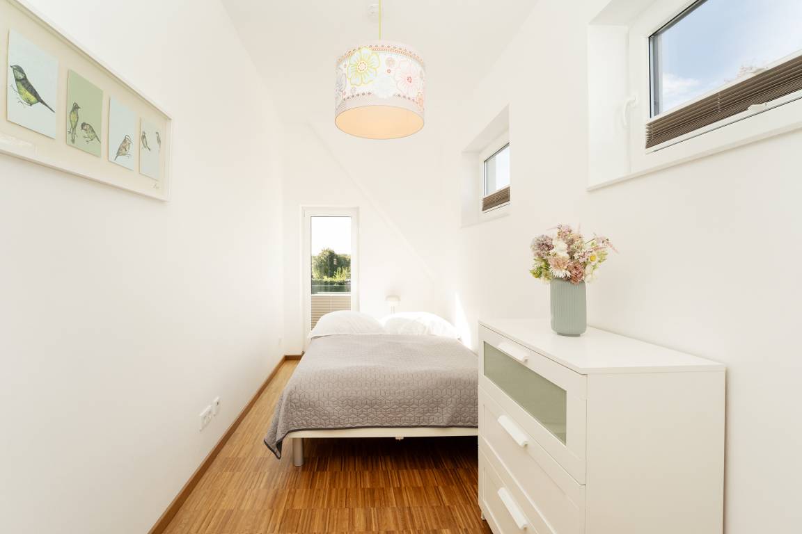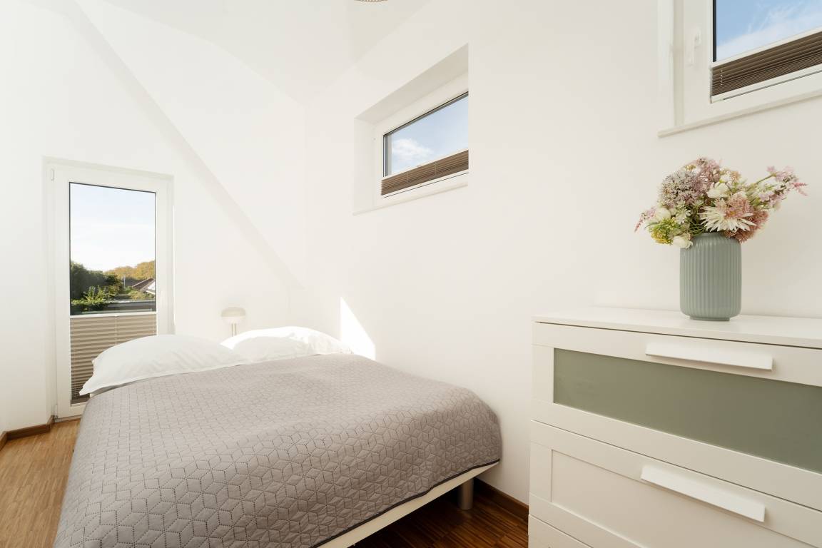 Schlafzimmer 3: 1 Doppelbett (140x200 cm), Kleiderschrank, Verdunkelung: Plissee, kein Platz für ein Babybett vorhanden