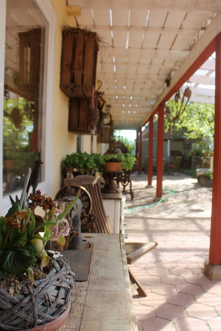 Der große Garten mit der Weinumwachsenden, überdachten Terrasse und den weiteren Ruhezonen ist das Herzstück unseres Hofes.