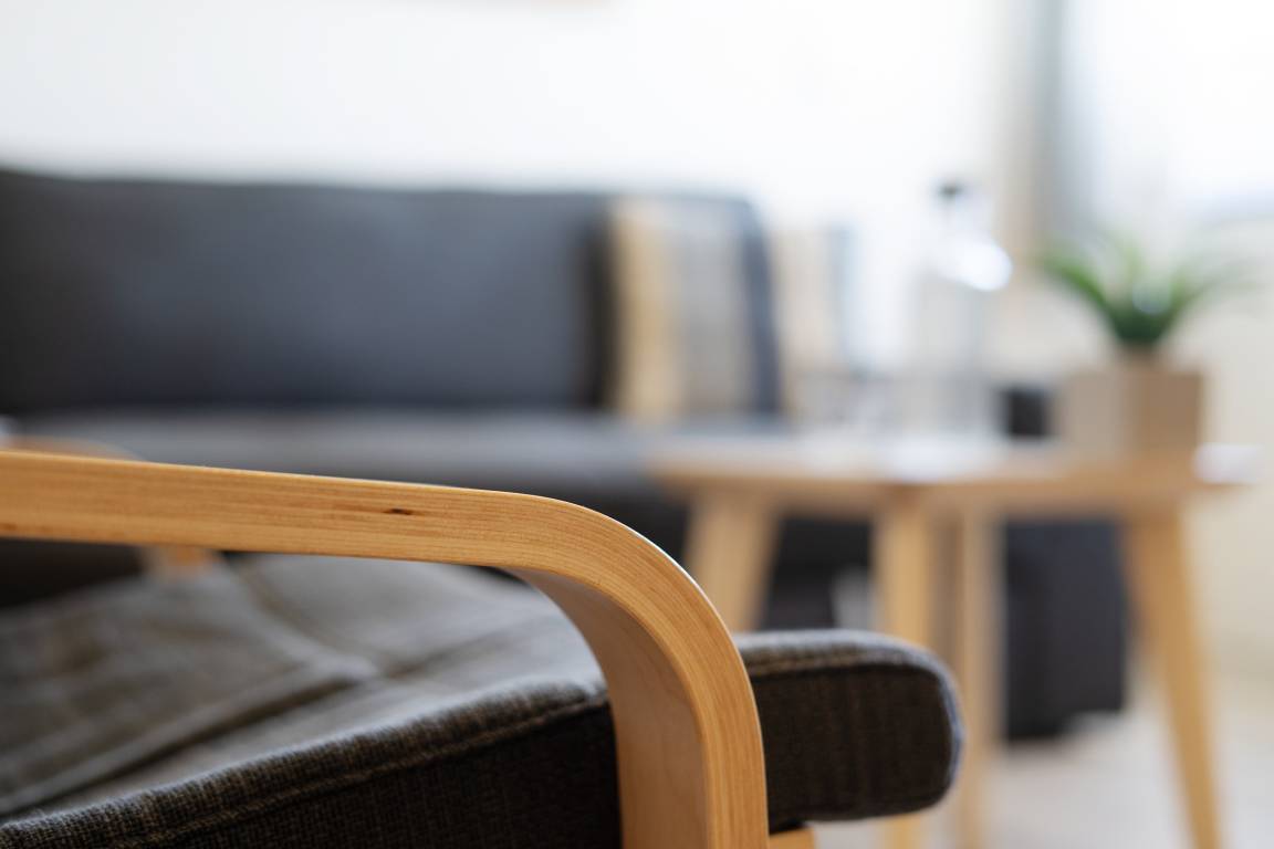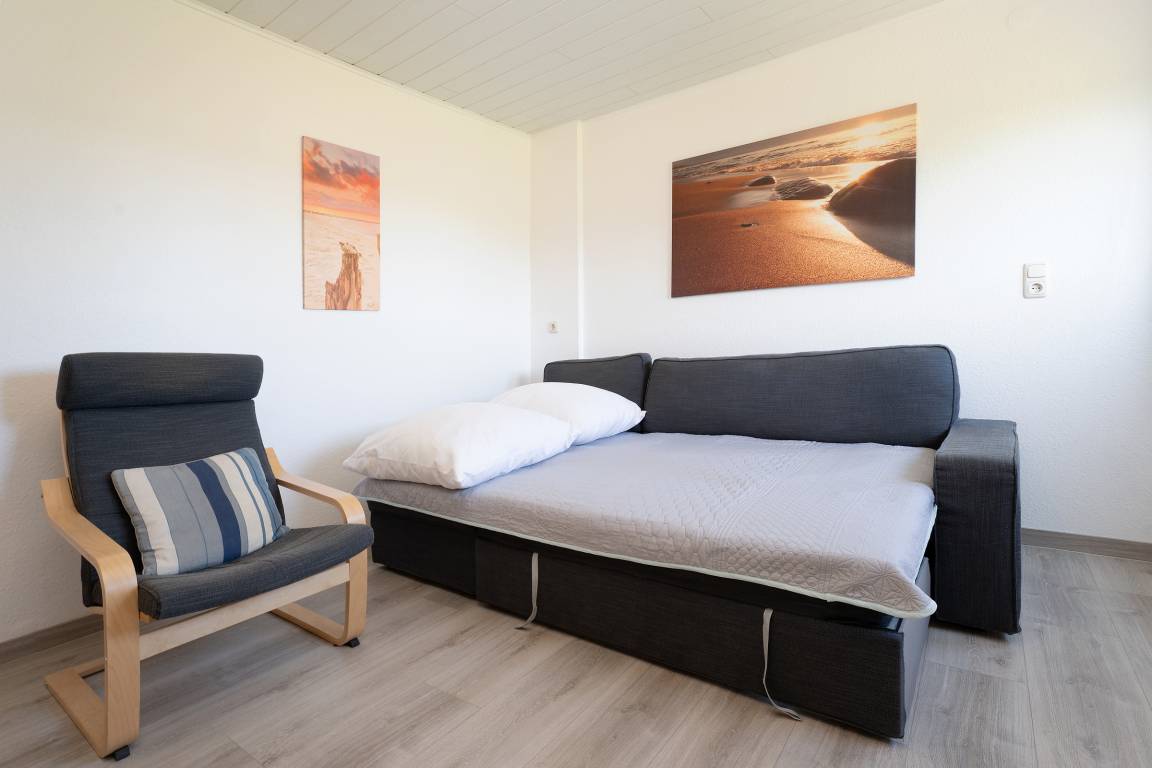 Wohnzimmer: 1 Schlafsofa (145x200 cm), TV, Verdunkelung: Plissees und Vorhänge