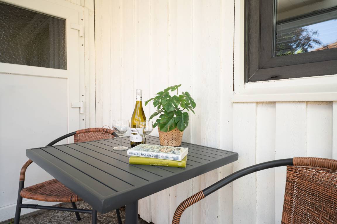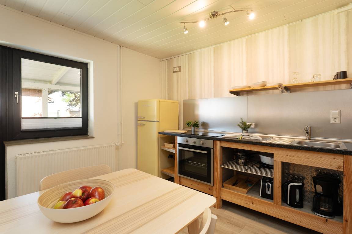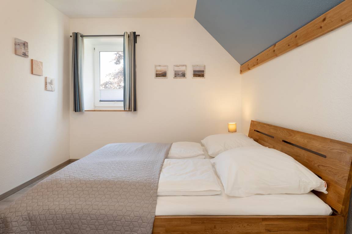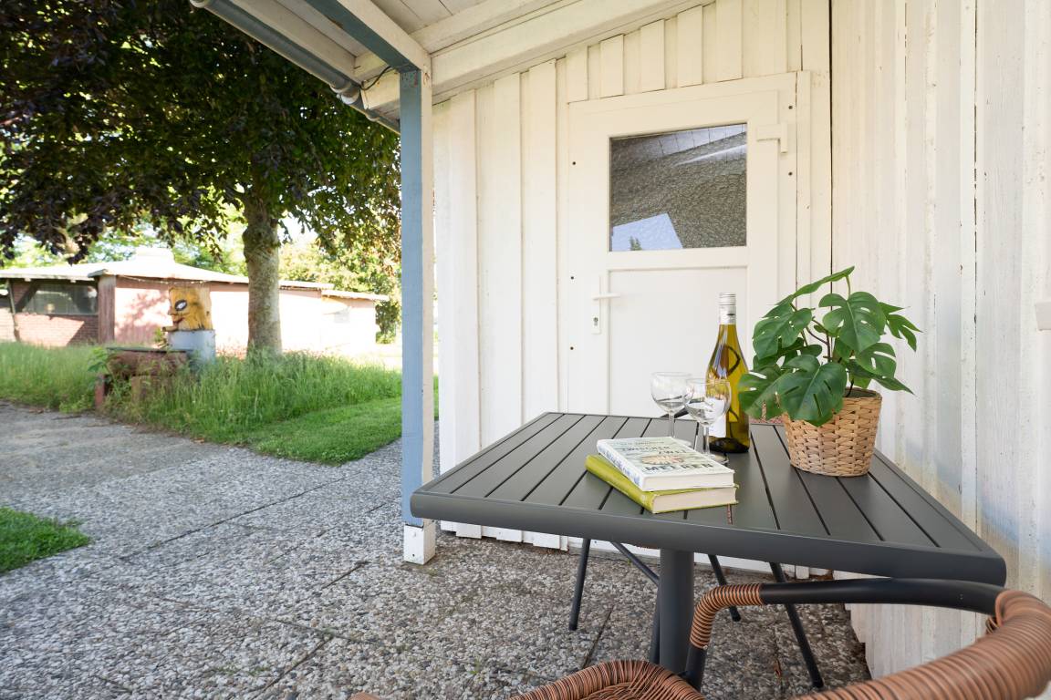 Der gemütliche Wohnbereich lädt mit Fernseher und einem bequemen Schlafsofa (145x200 cm) zum Verweilen ein – ideal für entspannte Abende nach einem erlebnisreichen Urlaubstag. Der Gemeinschaftsgarten mit eigenem Strandkorb bietet Ihnen viel Raum für erholsame Stunden im Freien. Die Küche lässt keine Wünsche offen: ausgestattet mit Backofen, Ceran-Herd, Kühlschrank mit Gefrierfach sowie einer Kaffeemaschine ist sie bestens geeignet für die Selbstverpflegung. Für gemeinsame Mahlzeiten bietet der Essbereich ein angenehmes Ambiente. Im Schlafzimmer steht ein komfortables Doppelbett (2x 90x200 cm) bereit. Das Badezimmer ist mit Dusche und WC ausgestattet.