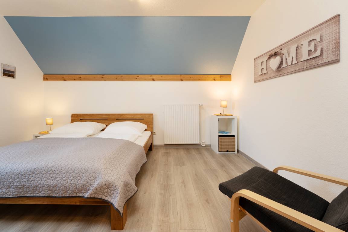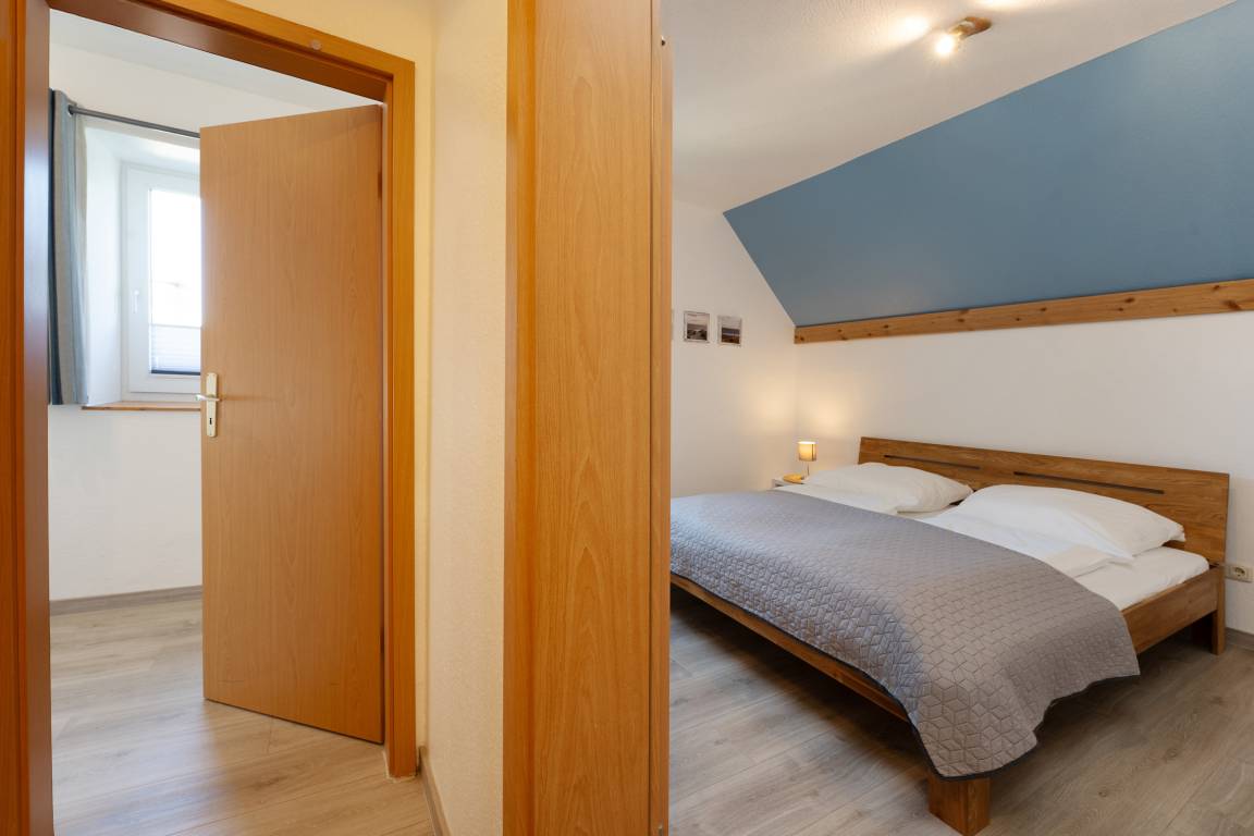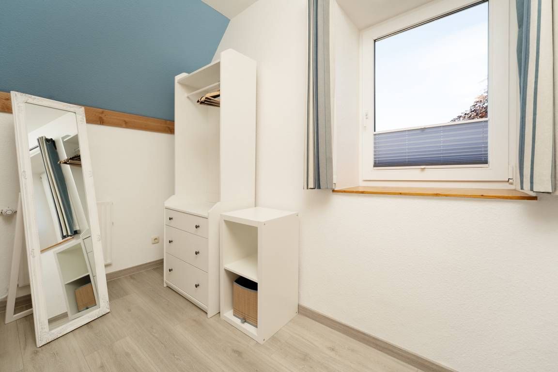 Schlafzimmer: 1 Doppelbett (2x 90x200 cm), Kleiderschrank, Verdunkelung: Plissees und Vorhänge, Platz für ein Babybett