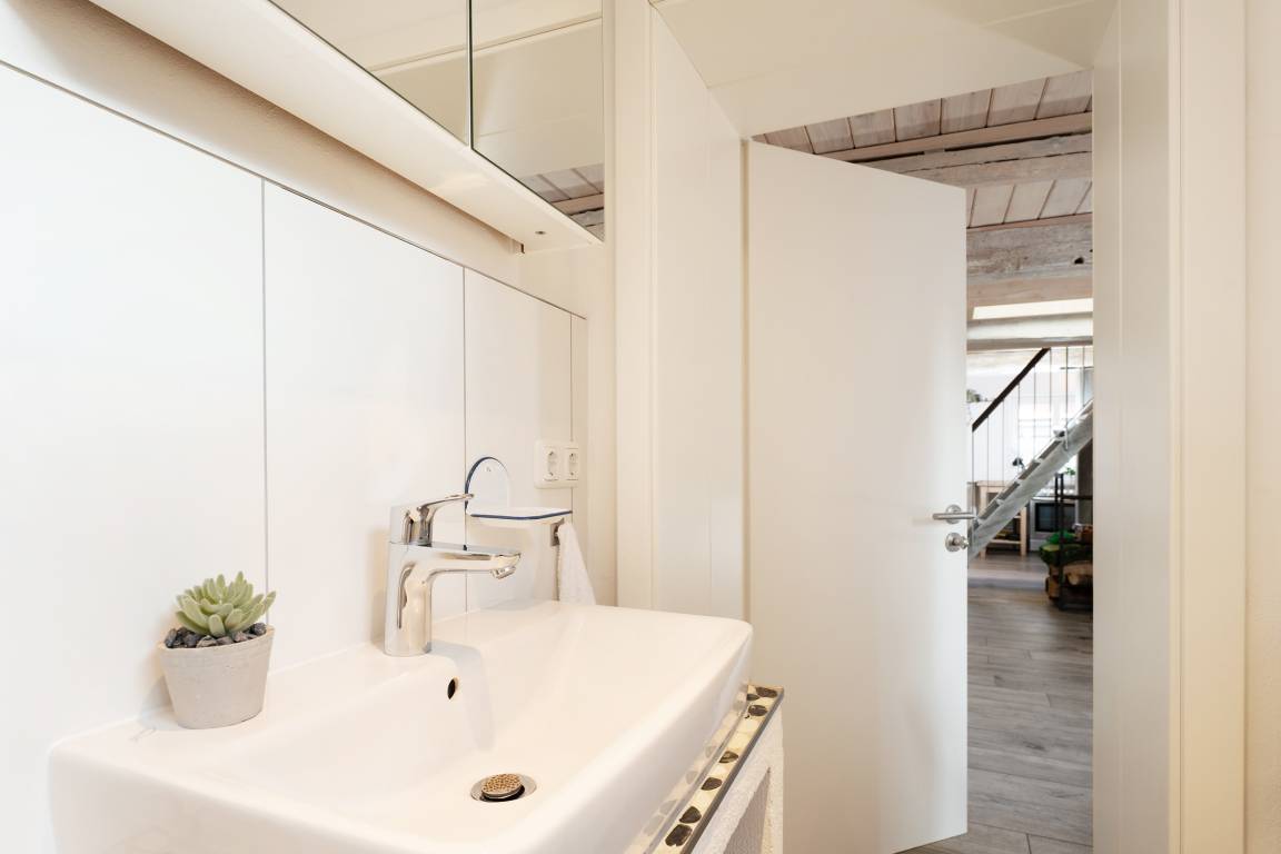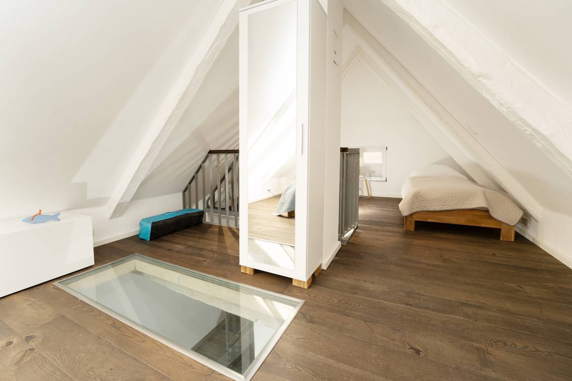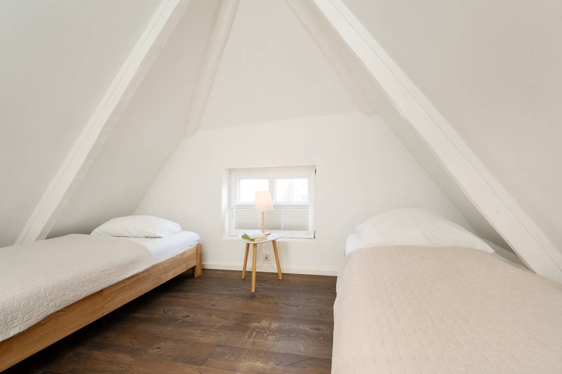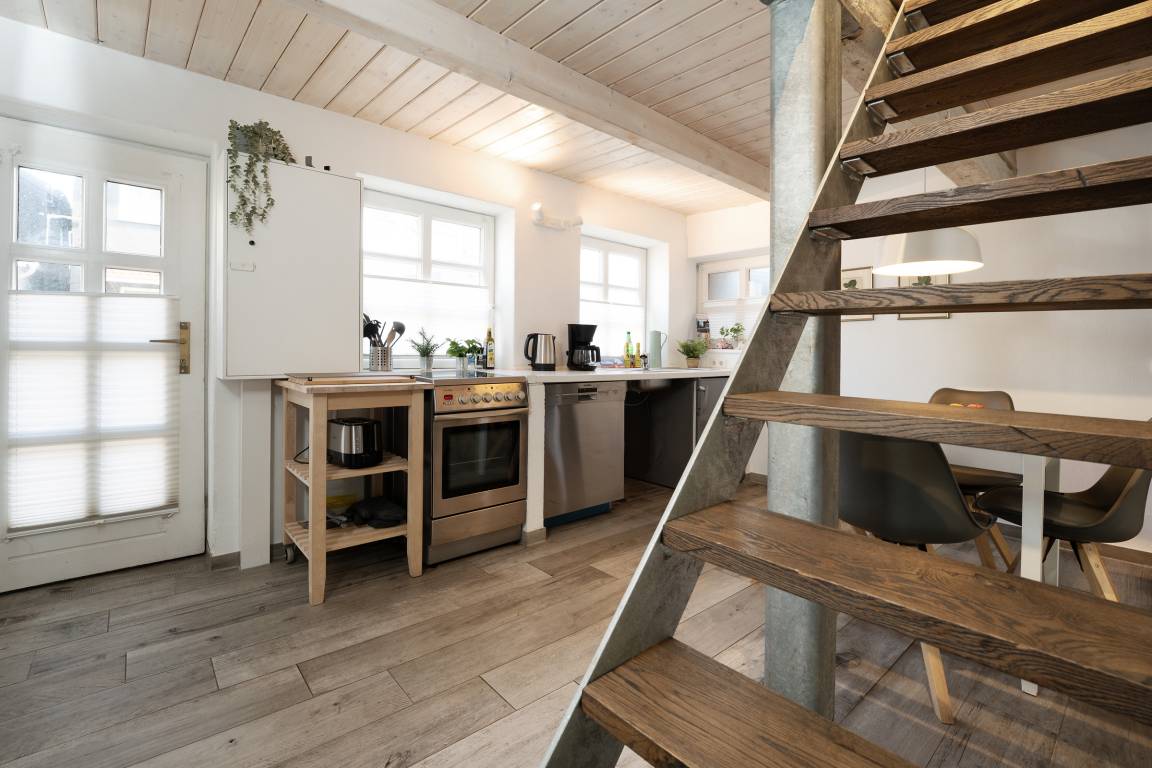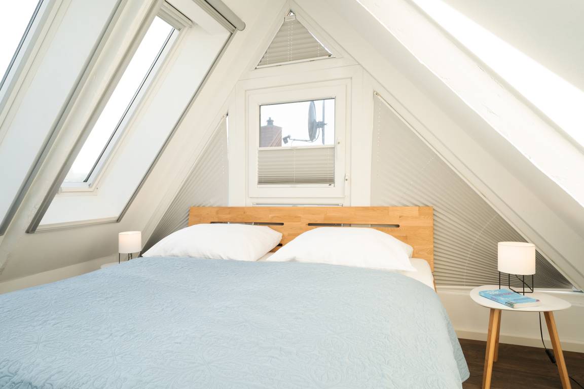Das Schlafzimmer im 1. OG verfügt über ein Doppelbett sowie zwei zusätzliches Einzelbetten und ist über eine offene Treppe mit dem Wohnbereich verbunden. Das moderne Bad im EG ist mit bodengleicher Dusche/WC, Haartrockner und beheizbarem Handtuchhalter ausgestattet. Ein Kinderhochstuhl und ein Kinderreisebett stehen zur Verfügung.