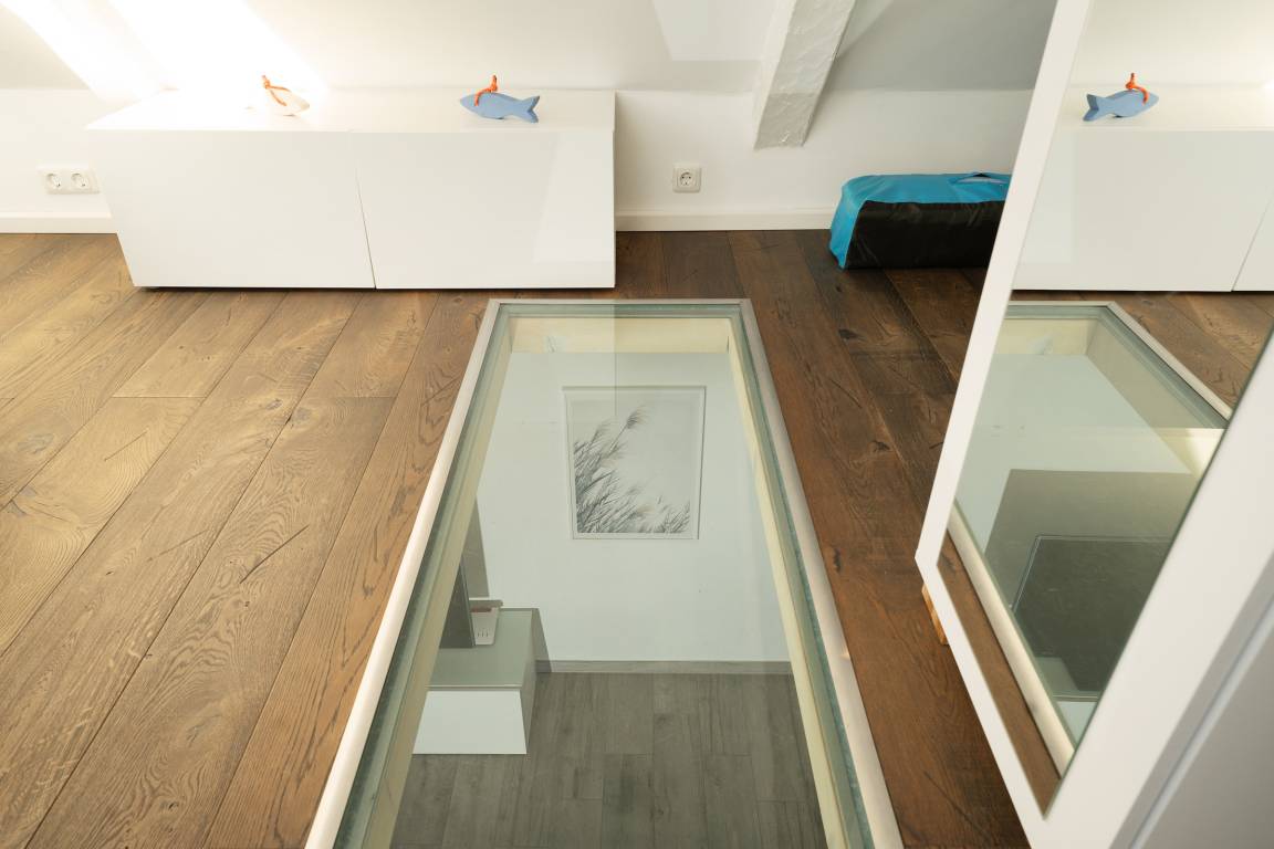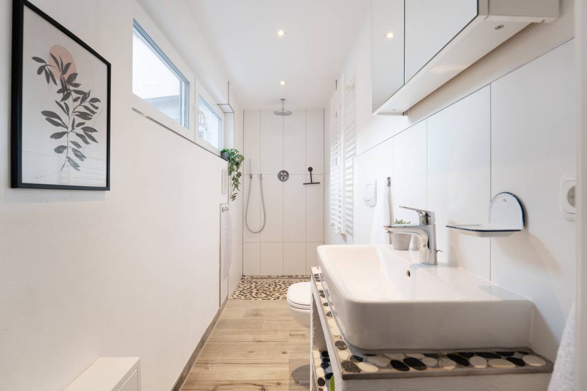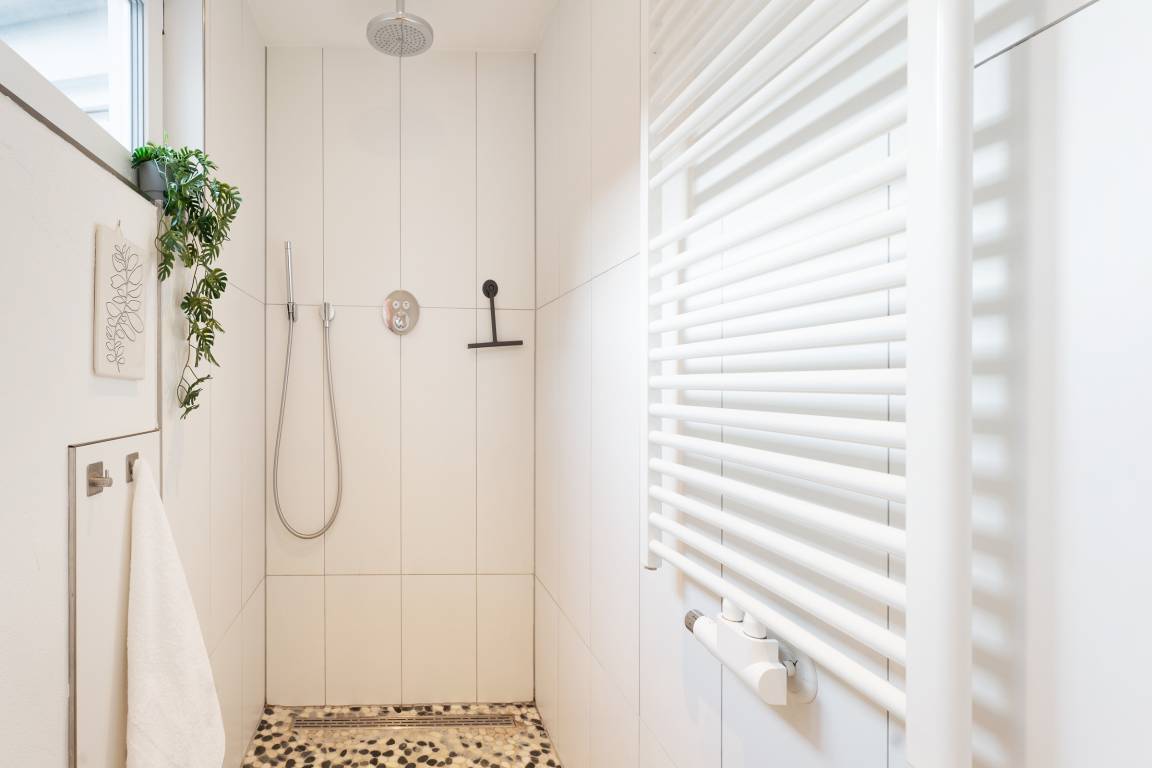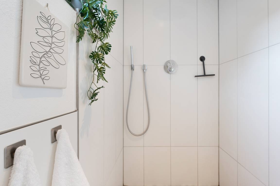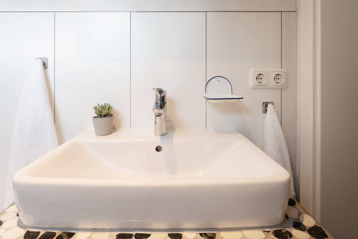 Das Schlafzimmer im 1. OG verfügt über ein Doppelbett sowie zwei zusätzliches Einzelbetten und ist über eine offene Treppe mit dem Wohnbereich verbunden. Das moderne Bad im EG ist mit bodengleicher Dusche/WC, Haartrockner und beheizbarem Handtuchhalter ausgestattet. Ein Kinderhochstuhl und ein Kinderreisebett stehen zur Verfügung.