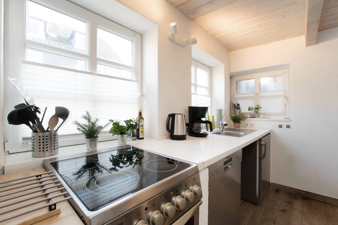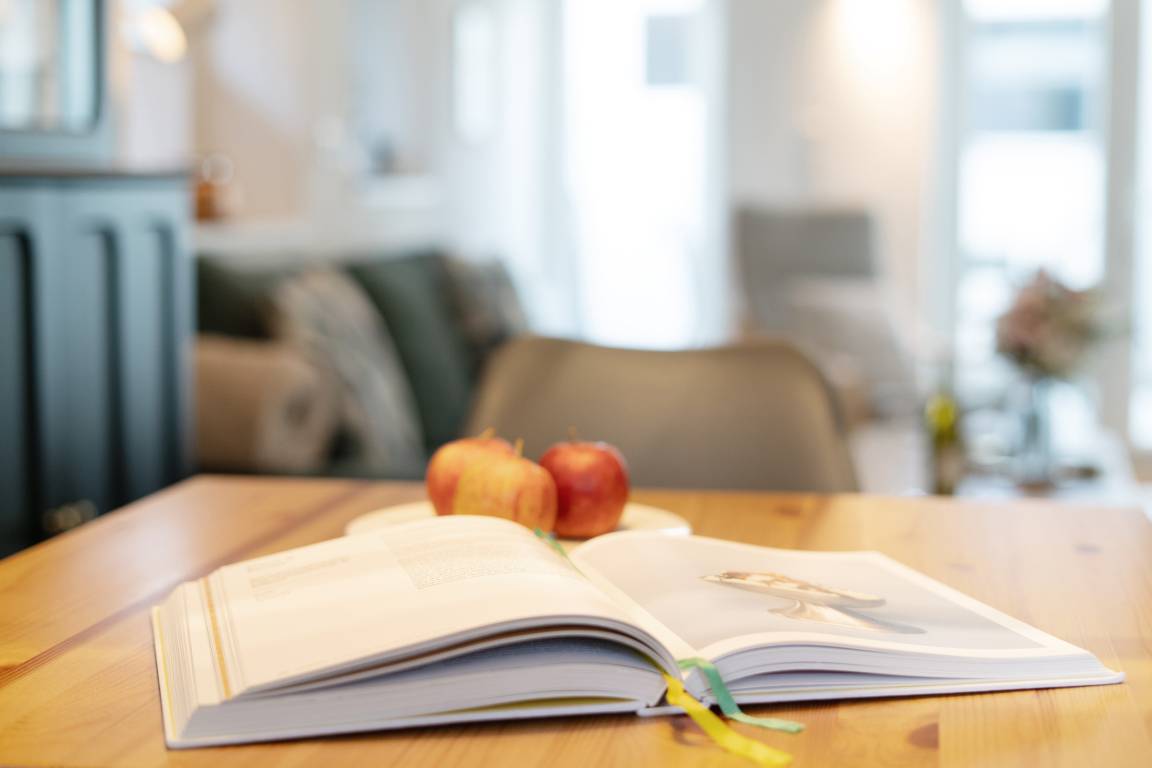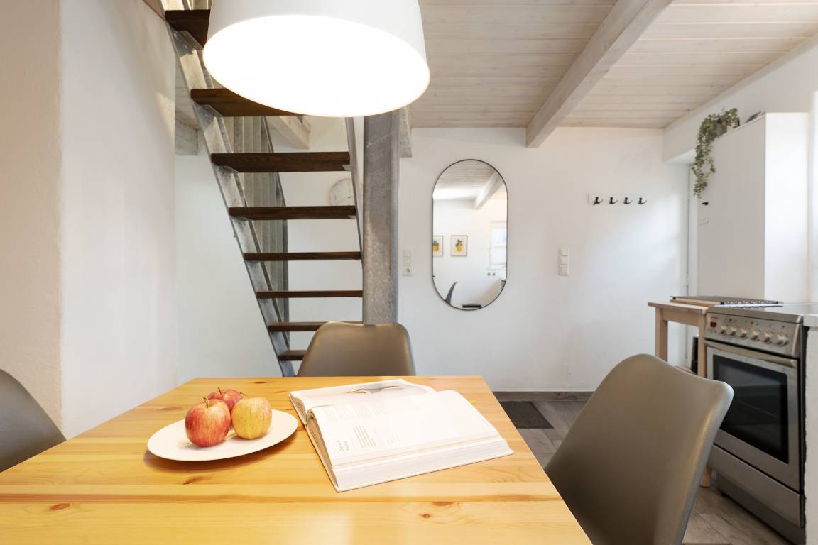 Der Rundgang beginnt im hellen Wohnbereich, der mit Fernseher und einem behaglichen Kaminofen zum Verweilen einlädt. Vom Wohnraum aus treten Sie direkt auf die West-Terrasse, die mit Gartenmöbeln und Elektrogrill ausgestattet ist – perfekt für entspannte Stunden im Freien. Weiter geht es in die gut ausgestattete Küchenzeile mit Backofen, Herd (4 Ceran-Kochfelder), Geschirrspülmaschine, Kühlschrank, Toaster, Wasserkocher und Kaffeemaschine - ein einladender Essbereich schließt sich direkt an.