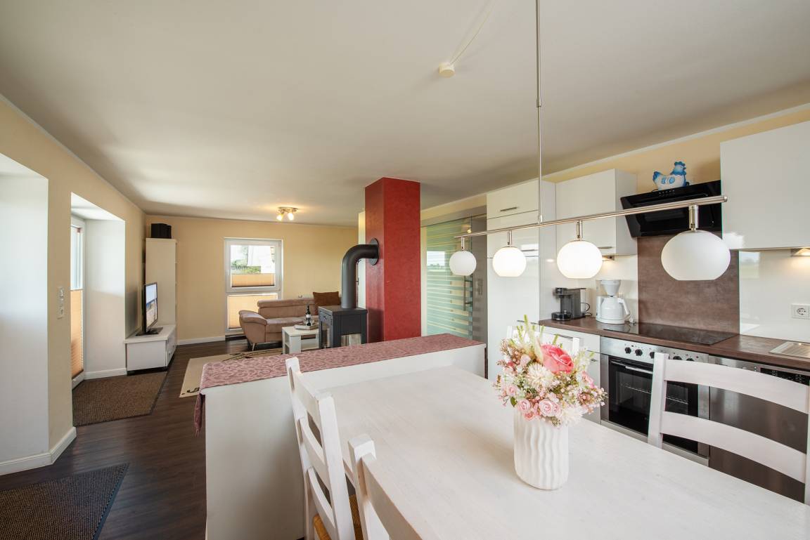 Vom liebevoll eingerichtete, lichtdurchfluteten Wohnzimmer mit großen Fensterflächen sowie Kaminofen und der großen Sonnen-Terrasse haben Sie einen wunderschönen Ausblick auf die Hafeneinfahrt von Burg Staaken, den Yachthafen von Burg Tiefe, den Burger Binnensee und über die direkt angrenzenden Felder. Hier sind Rehe und Hasen Ihre direkten Nachbarn. Von Ihrem Strandkorb aus können Sie in Ruhe das Ein- und Auslaufen der Schiffe beobachten, Abends den Sonnenuntergang genießen, während Sie auf dem Elektrogrill köstliche Speisen zubereiten oder dafür die gut ausgestattete Küche mit großem Essbereich nutzen. Diese ist ideal in den Wohnbereich integriert.