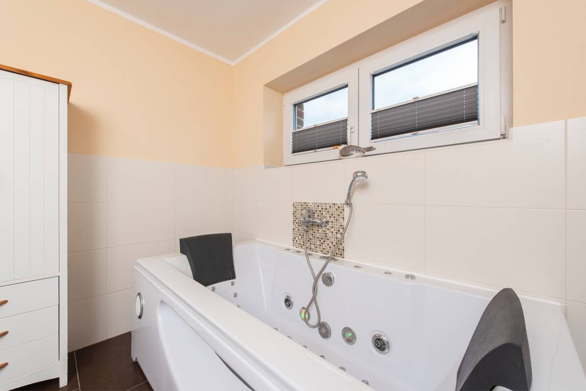 Das moderne Badezimmer ist zudem mit einer gemütlichen Badewanne ausgestattet.