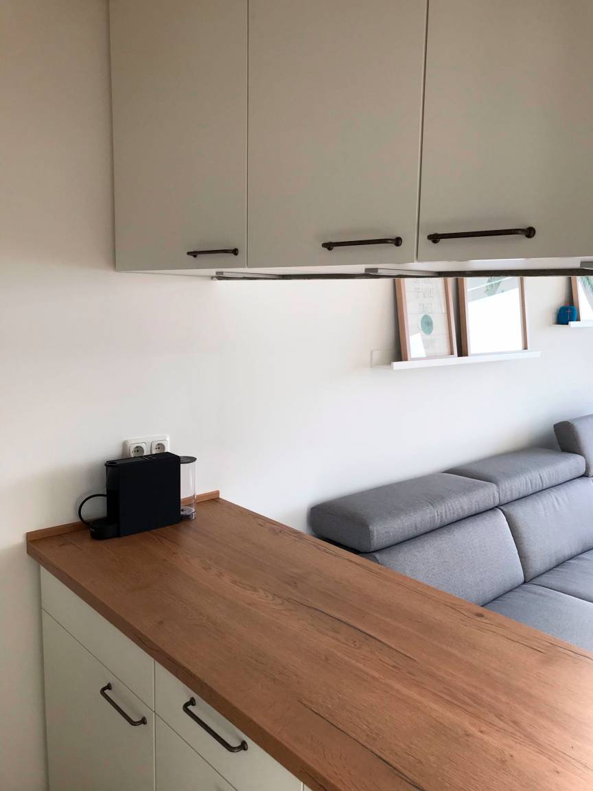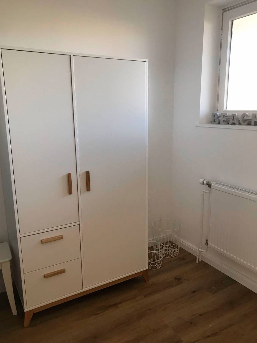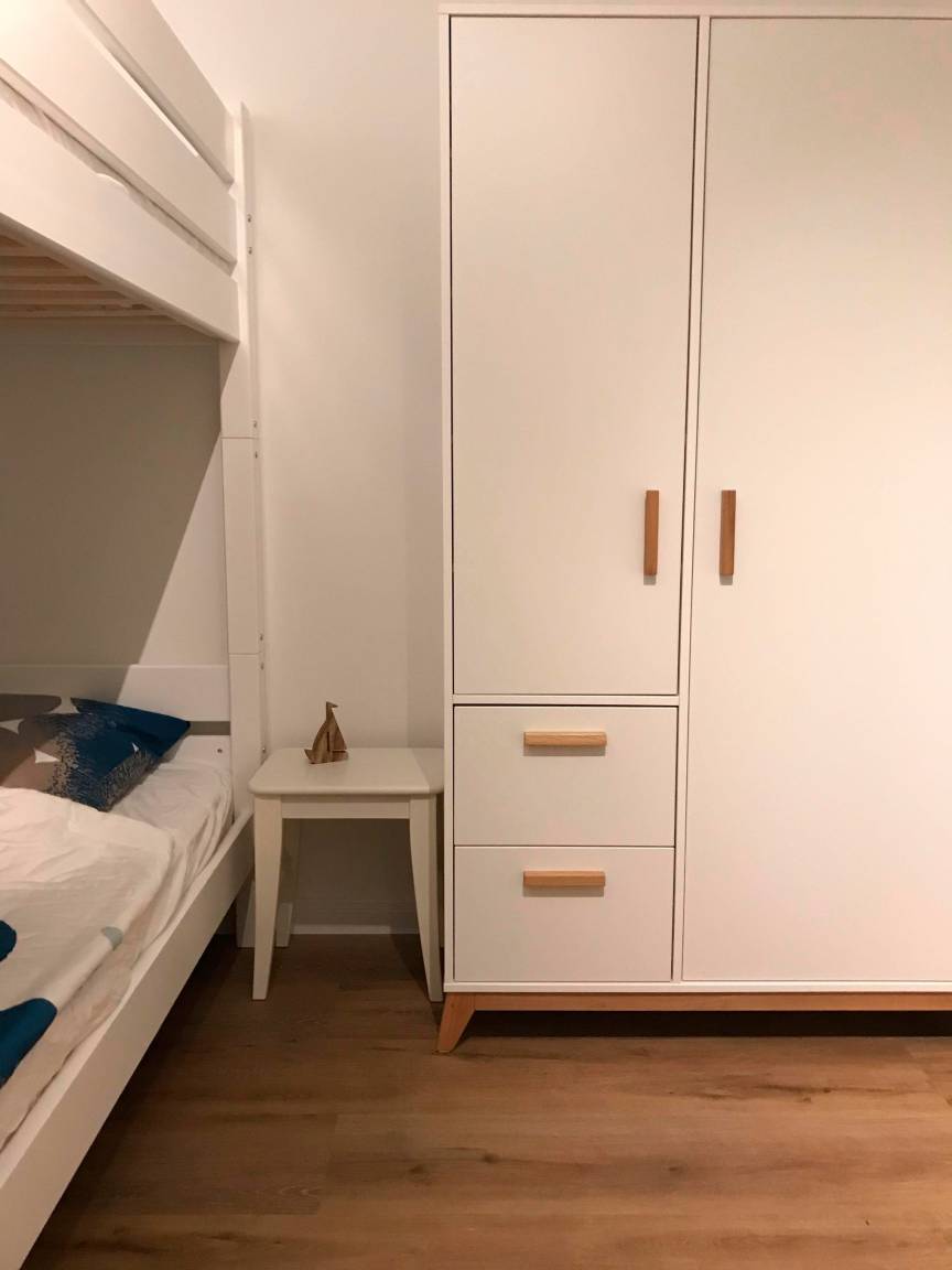 Die Wohnung wurde 2019 renoviert und verfügt über ein Schlafzimmer mit einem Etagenbett und einem Kleiderschrank. Der hell eingerichtete Wohnbereich verfügt über eine ausklappbare Schlafcouch (140x200cm), die mit wenigen Handgriffen zu einem Bett mit Lattenrost und Federkernmatratze umfunktioniert werden kann. Vom gesamten Wohnbereich haben Sie einen weitläufigen Blick auf die Ostsee. Des Weiteren verfügt der Wohnbereich über ein Kabel-TV sowie einen DVD-Player. Im alten Bauernschrank finden Sie Gesellschaftsspiele und Bücher. Die integrierte Küche ist komplett ausgestattet mit Spülmaschine, E-Herd mit Induktionskochfeld, Backofen, Dunstabzug, Kühlschrank mit Gefrierfach, Wasserkocher, Toaster, Kaffee- und Kapselmaschine.