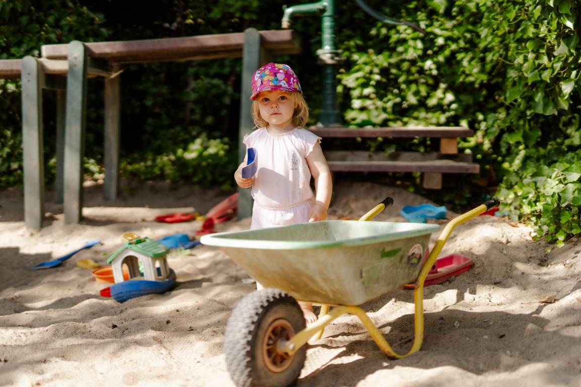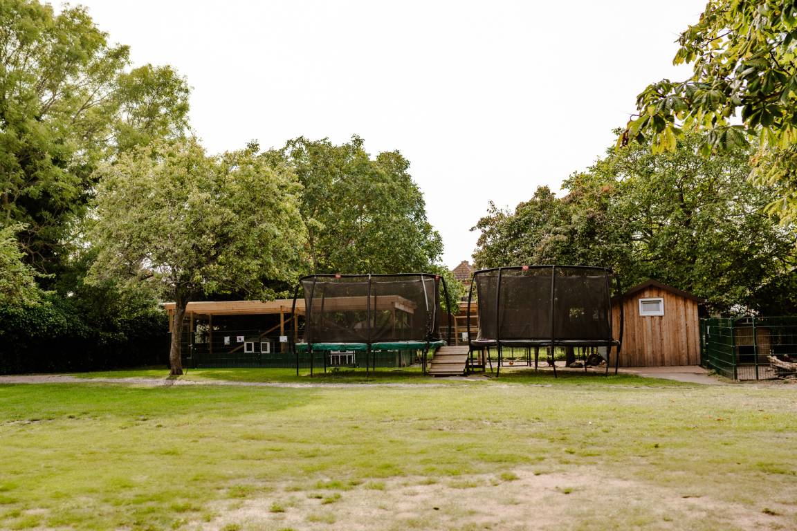 Die Südterrasse liegt im großen Garten, wo die Kinder Trampolin springen und Fußball spielen können.