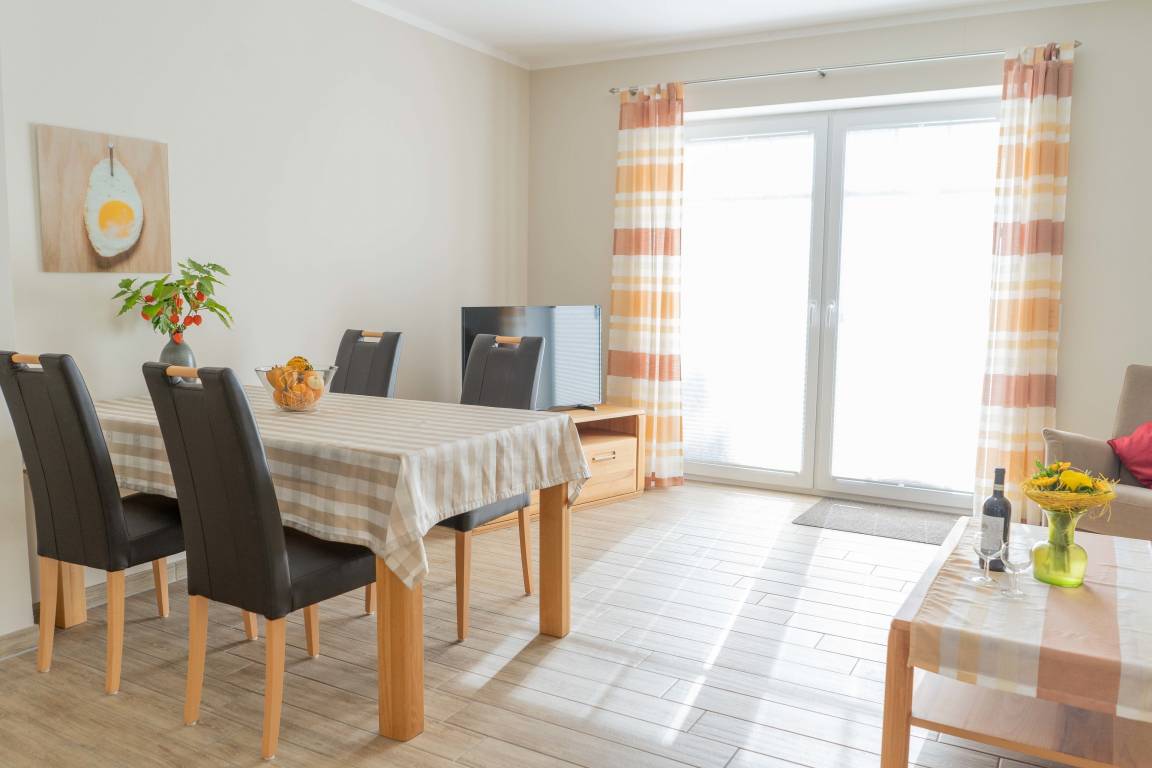 Wohnraum mit Sitzgruppe und Essplatz, WLan, Flachbildfernseher, direkter Zugang zur Südterrasse, voll ausgestattete Küche, Herd mit Ceran-Kochfeld und Backofen, Mikrowelle, Geschirrspüler, Tiefkühlfach, Kaffeemaschine, Wasserkocher, Toaster, Mixer usw.