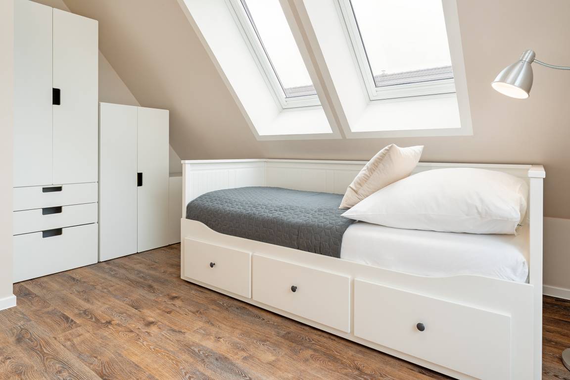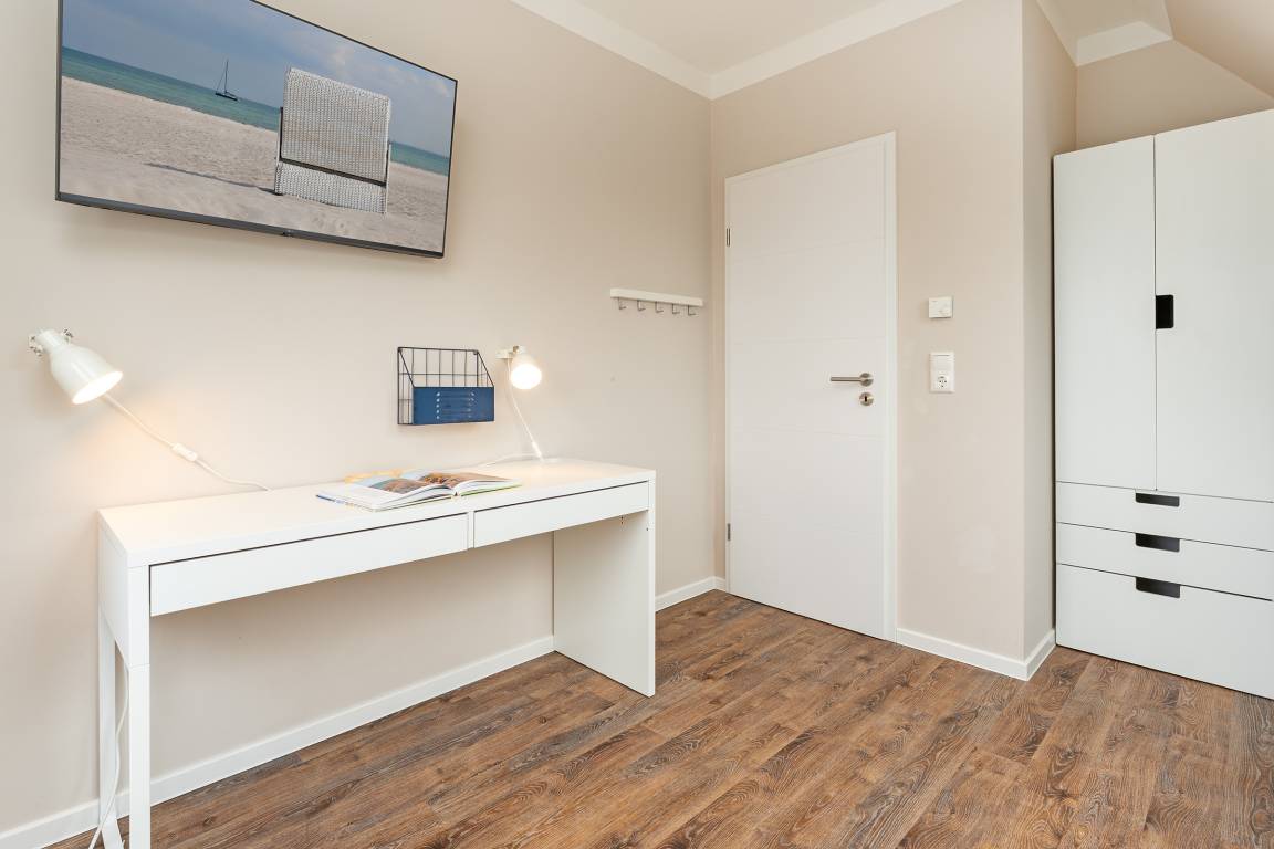 Schlafzimmer 3: 1 Einzelbett, Verdunkelung: elektronische Außenjalousien, Kleiderschrank, TV, Platz für ein Babybett vorhanden