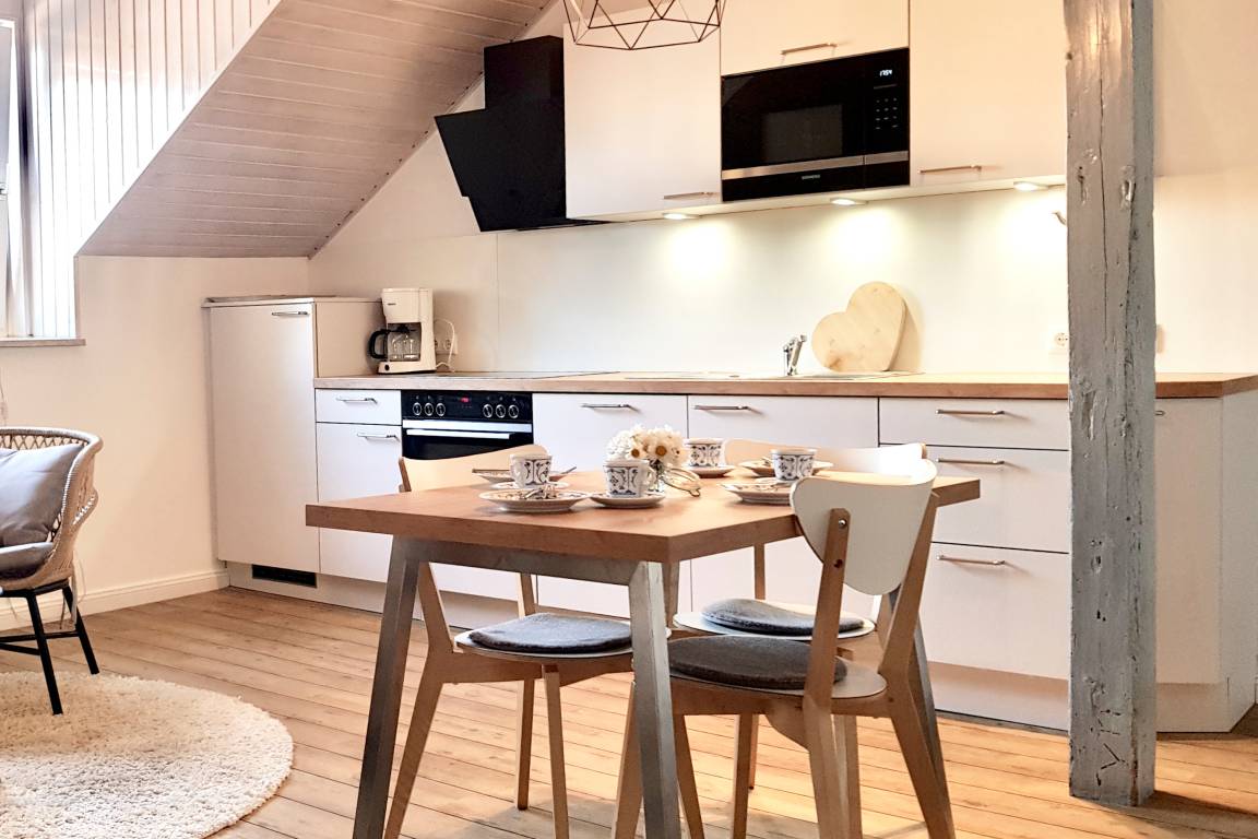 Die Ferienwohnung "Buernsuite" auf unserem Hof befindet sich in unserem ursprünglichen Bauernhaus. Sie ist in der 1. Etage, ca. 65qm groß und bietet damit ordentlich Platz für bis zu 4 Personen plus ein Kleinkind (Babybett). Im skandinavischen Wohn- und Esszimmer mit Küchenzeile könnt Ihr es Euch gemütlich machen. Eure zwei Schlafzimmer sind mit zwei Doppelbetten ausgestattet. Optional stellen wir noch ein Babybett. Ein schickes Bad mit Dusche gehört natürlich auch dazu, außerdem habt Ihr eine Südterrasse im Bauerngarten. Auch auf dem gesamten Hofgelände findet Ihr genügend Lieblingsplätze für Groß und Klein. Bei kühlerem Wetter könnt Ihr Euch in der Infrarotkabine ("Wohlfühlsauna") in unserer Scheune aufwärmen. Auf die Kleinen warten unsere Dinocars und andere Fahrzeuge, ein Spielplatz und Trampolin, eine Spielhalle, Tischkicker, Tischtennis, ein Spielzimmer und ein riesiger Garten zum Austoben. Außerdem freuen sich unsere Ziegen und Kaninchen auf einen Snack oder eine Streicheleinheit. Also: Auf gehts, einfach mal stranden!