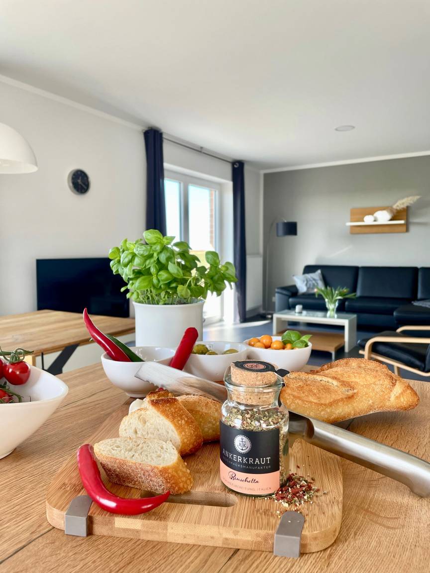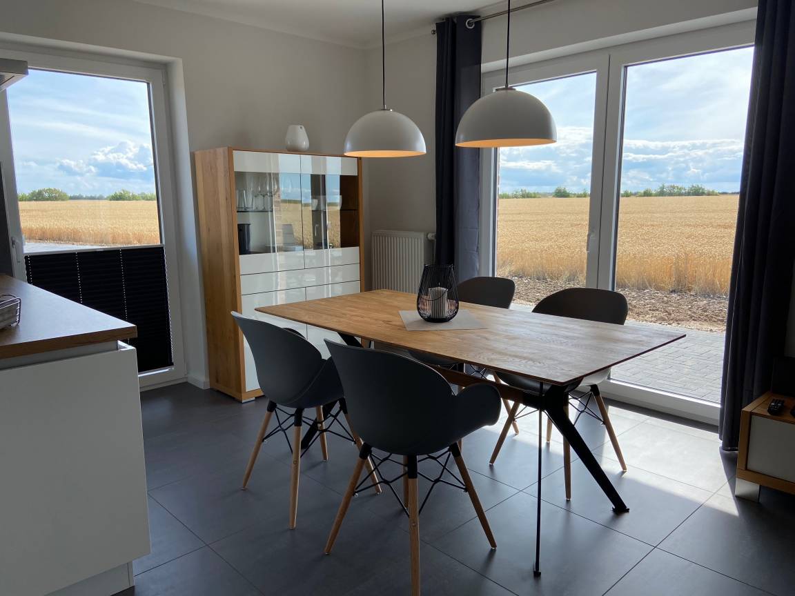 Bei dem Ferienhaus Westwind handelt es sich um einen 100 m/2 großen ebenerdigen Bungalow. Dieser verfügt über zwei Schlafzimmer mit Doppelbetten und über zwei Duschbäder mit begehbarer Dusche. Das Highlight des Hauses ist der große Wohn- Essbereich mit Küche und Kochinsel. Von diesem gelangt man auf die Süd-/Westterrasse mit Blick auf die Felder.