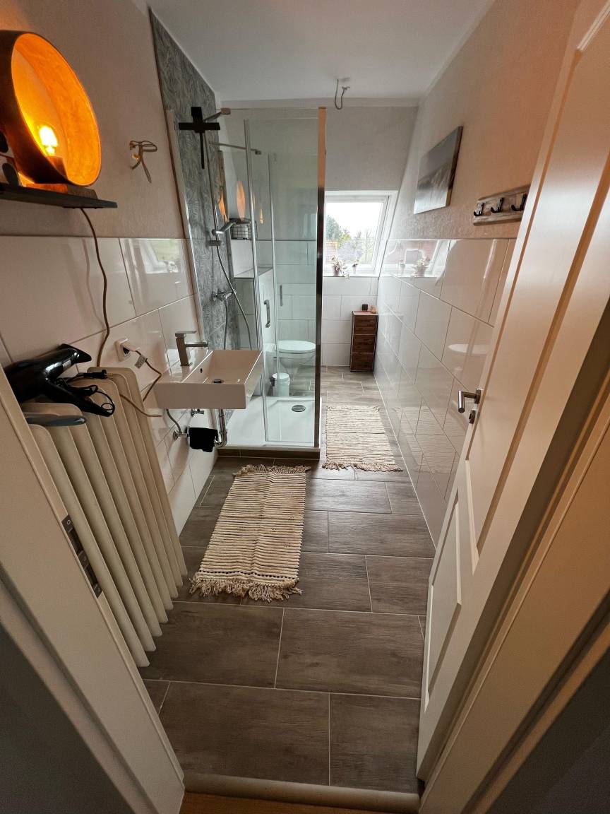 Das Badezimmer ist mit einer Dusche ausgestattet.