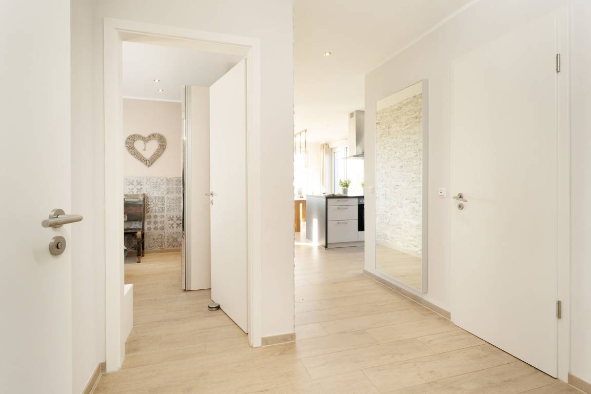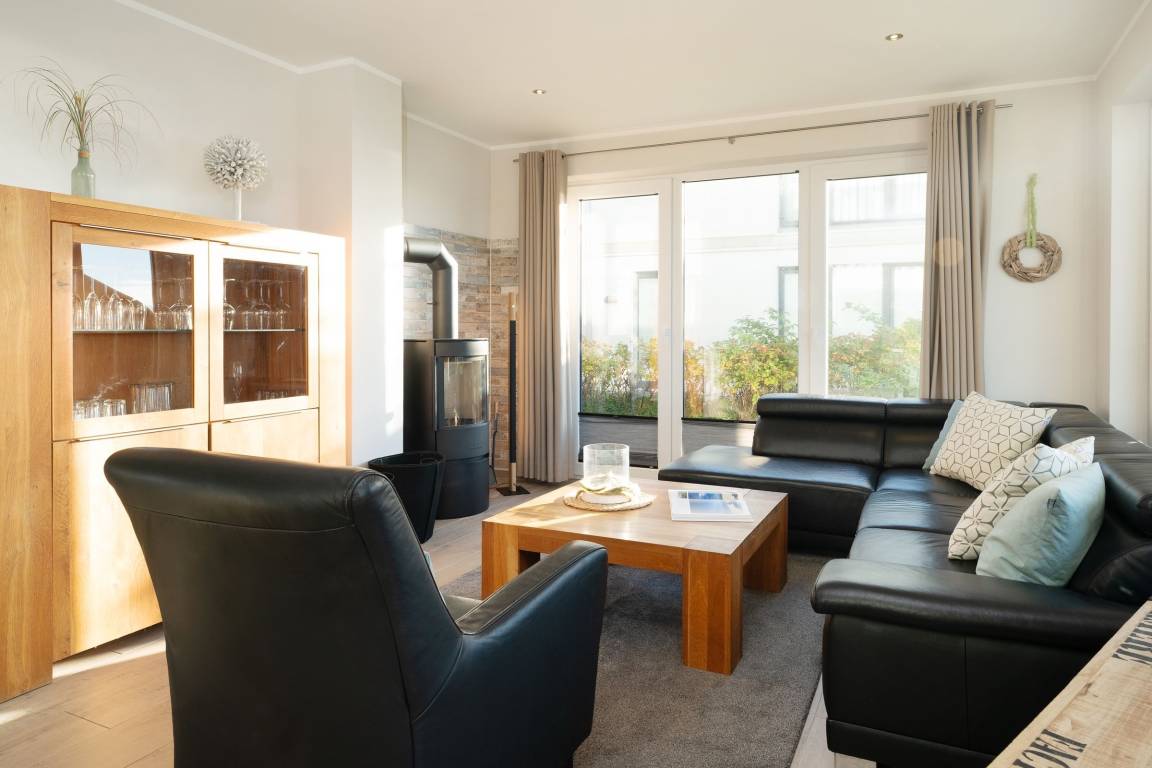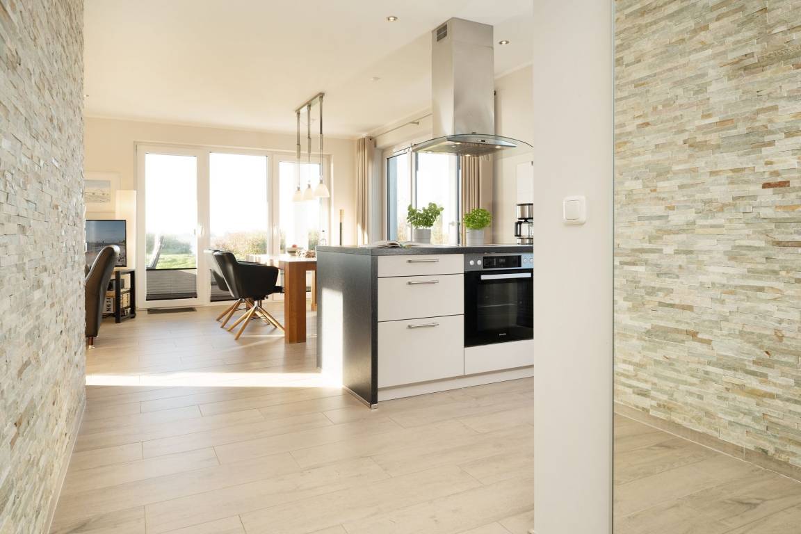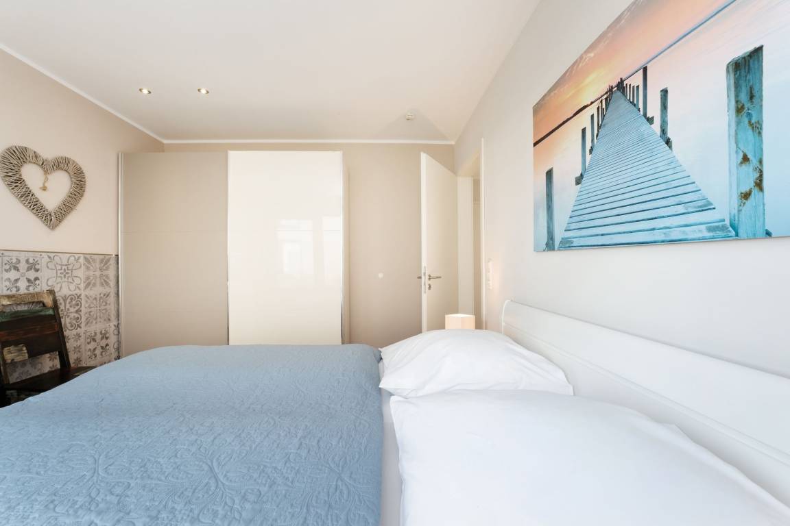 Die gehobene Ausstattung des Objekts wird Sie sofort begeistern. Der helle Wohnbereich bietet einen tollen Blick auf die Ostsee. Gemütliche Ledermöbel laden hier zum Verweilen ein. Das Highlight ist sicher die große teilweise überdachte Terrasse. Auch von hier haben Sie einen tollen Blick auf die Ostsee und das Wahrzeichen der Insel Fehmarn: die Fehmarnsundbrücke. Hier können Sie perfekt bei einem guten Frühstück in den Tag starten, die Mittagsstunden auf der Sonnenliege verbringen oder abends den Sonnenuntergang bewundern. Die zum Wohnbereich hin offene Küche mit angrenzendem Essbereich lässt durch ihre sehr gute Ausstattung beim Kochen keine Wünsche offen. Die beiden modern eingerichteten Schlafzimmer, eins mit einem Doppelbett und TV-Gerät, das andere mit zwei Einzelbetten, bieten den entsprechenden Wohlfühlfaktor zum Erholen nach ereignisreichen Urlaubstagen. Das großzügige Bad ist mit einer bodengleichen Dusche ausgestattet. Ein großes Fenster sorgt für Tageslicht und damit einen sonnigen Start in den Tag. Eine kleine Sauna steht Ihnen ebenfalls in der Unterkunft zur Verfügung. Die Wohnung ist mit Fußbodenheizung ausgestattet und komplett gefliest.