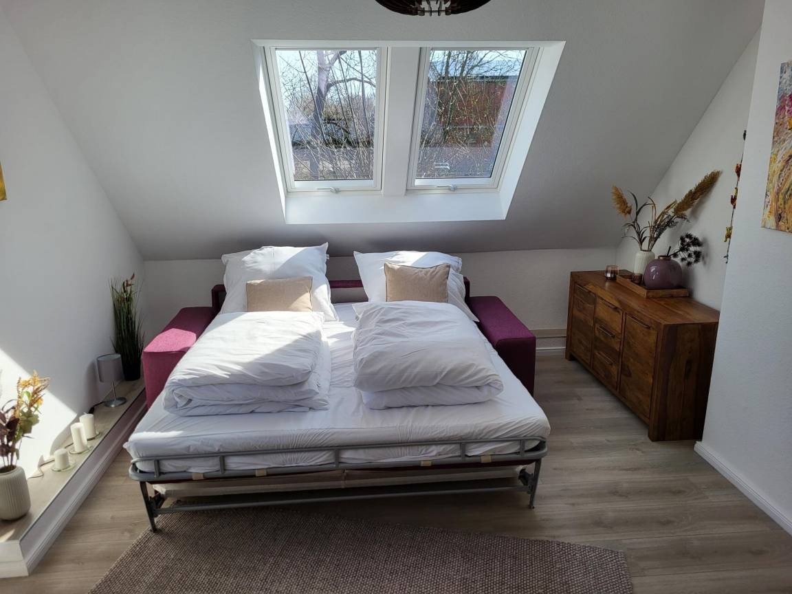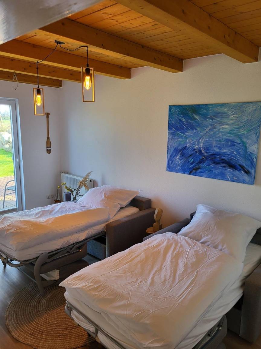 Im Obergeschoss befinden sich zwei weitere Schlafzimmer, in einem steht eine Schlafcouch für zwei Personen, in dem anderen Schlafzimmer befindet sich ein Doppelbett.