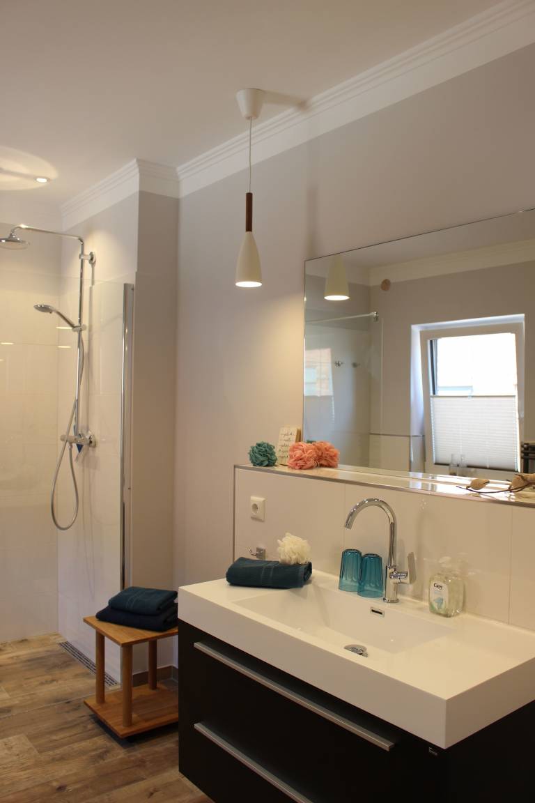„Eine schöne Wohnung für zwei, stilvoll eingerichtet, mit einem Ess- und Wohnbereich, einer Terasse mit Gartenmöbeln. Ein geräumiges Schlafzimmer mit einem Boxspringbett (gute Matratze) und ein großes, modernes Bad mit ebenerdiger Dusche, Waschtisch und Toilette. Eine große Wiese lädt zum Sonnenbaden ein und für Fahrräder gibt es Unterstellmöglichkeiten. Die Vermieter sind sehr nett und erkundigen sich auch zwischendurch ob alles in Ordnung ist. Diese Vermieter und die Wohnung sind sehr zu empfehlen. Wir werden nicht das letzte Mal dort gewesen sein!“