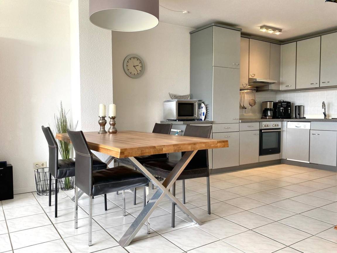 In der Wohnküche können Sie dank der umfangreichen Ausstattung problemlos leckere Gerichte zubereiten. Hier stehen Ihnen unter anderem eine Mikrowelle, ein Geschirrspüler, Kaffeemaschine und Toaster bereit. Die Gerichte können an dem angrenzenden Esstische verzehrt werden.