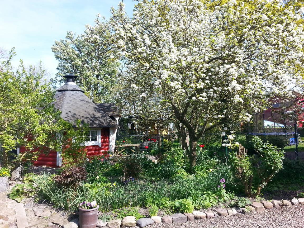 Am Haus befindet sich ein Spielplatz mit Rutsche, Spielhaus, Sandkasten Schaukel und Trampolin.