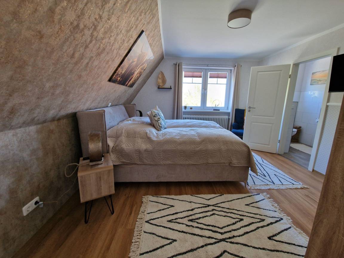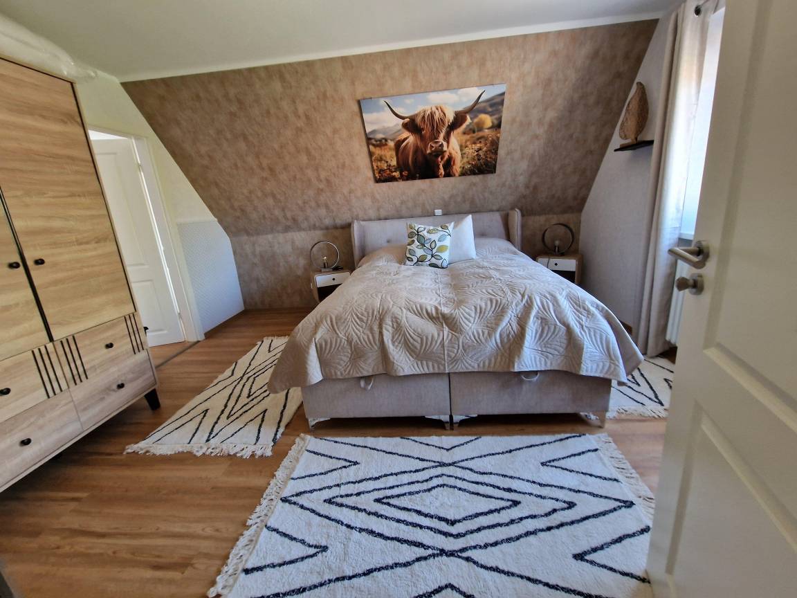 Das Schlafzimmer ist ausgestattet mit einem Boxspringbett der Größe 160x200.