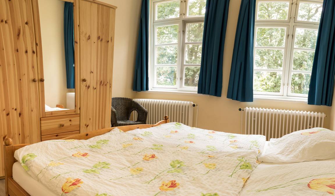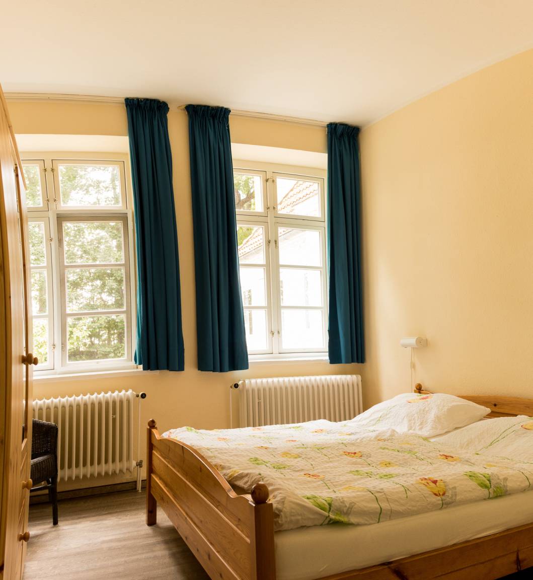 Schlafzimmer 1: 1 Doppelbett (2x 90 x 200 cm), Kleiderschrank, Verdunkelung: Vorhang, Platz für ein Babybett vorhanden