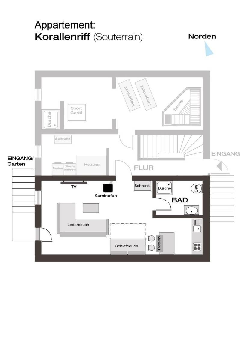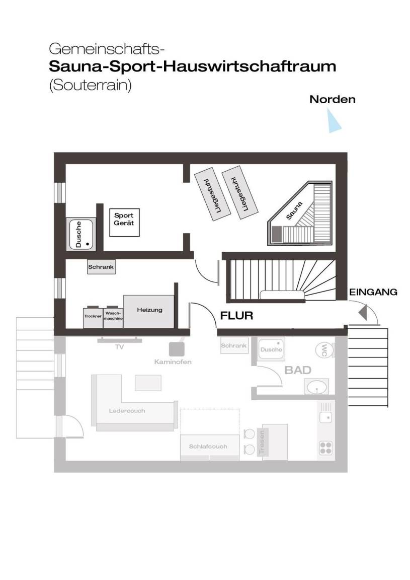 Sauna- und Sportraum mit Dusche zur kostenlosen Benutzung sowie Hauswirtschaftsraum mit Waschmaschine und Trockner stehen zentral im wohnlich ausgebauten Keller zur Verfügung.