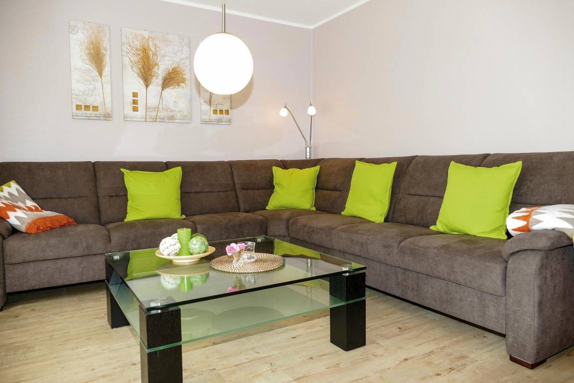 Im Wohnzimmer erwartet Sie eine große Wohnlandschaft um gemütliche Abende mit vorhandenen Büchern und Spielen zu verbringen.