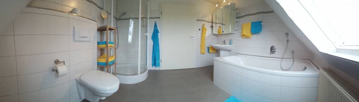 * Badezimmer mit Dusche, Badewanne, Föhn
