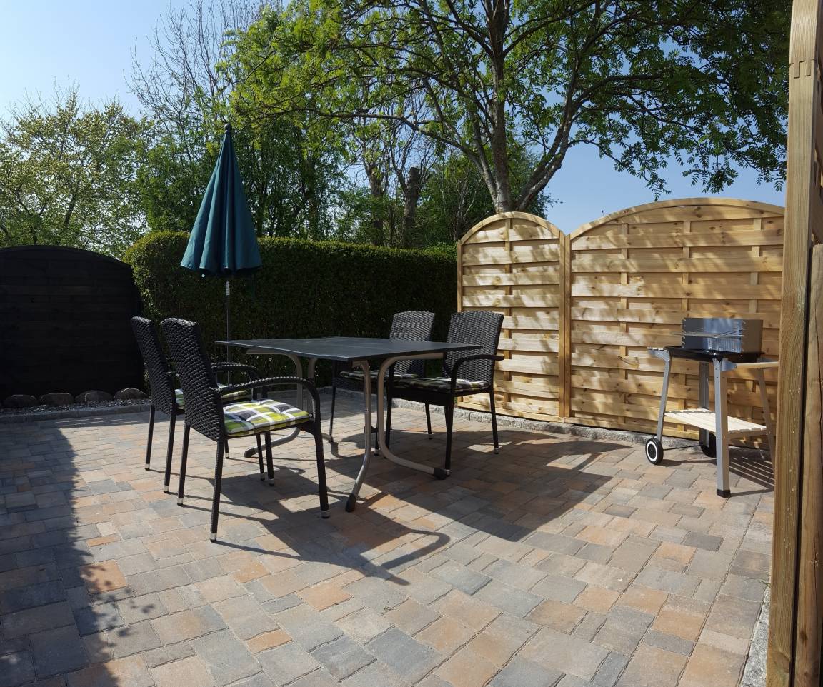 * Terrasse mit Sitzmöbeln, Sonnenschirm, Gartenliegen, Grill